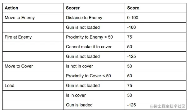 在 Utility AI 中,角色的每个 action 被标记一个 score(也就是 Utility 值),也可以称为权重。最终角色采取什么 action,其决策的依据就是:选取最大 score 的那个 action。