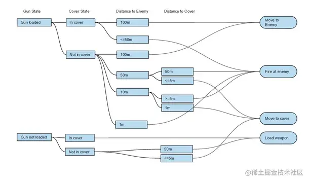 行为树在遍历的时候是有顺序的:从上到下,从左到右,只要任意一个叶子节点满足条件就立即返回,不会遍历整棵树。从顺序的角度来说,设计行为树的分支时候,就要考虑各个分支的先后顺序,而 Utility AI 不存在这个问题,它唯一关系的问题就是权重值 score。