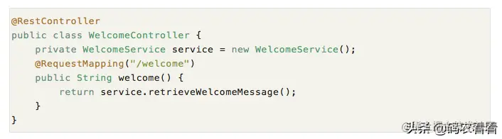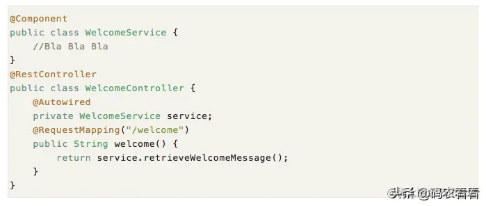 使用 @Component告诉 SpringFramework:这是一个你需要管理的 bean。 使用 @Autowired告诉 SpringFramework:找到这个特定类型的正确匹配并自动装配它。 在下面的示例中, Spring框架将为 WelcomeService创建一个 bean,并将其自动装入 WelcomeController。 在单元测试中,我可以要求 Spring框架将 WelcomeService的模拟自动连接到 WelcomeController。( SpringBoot使用 @MockBean可以很容易地做到这一点。但是,这是另外一件事了!)