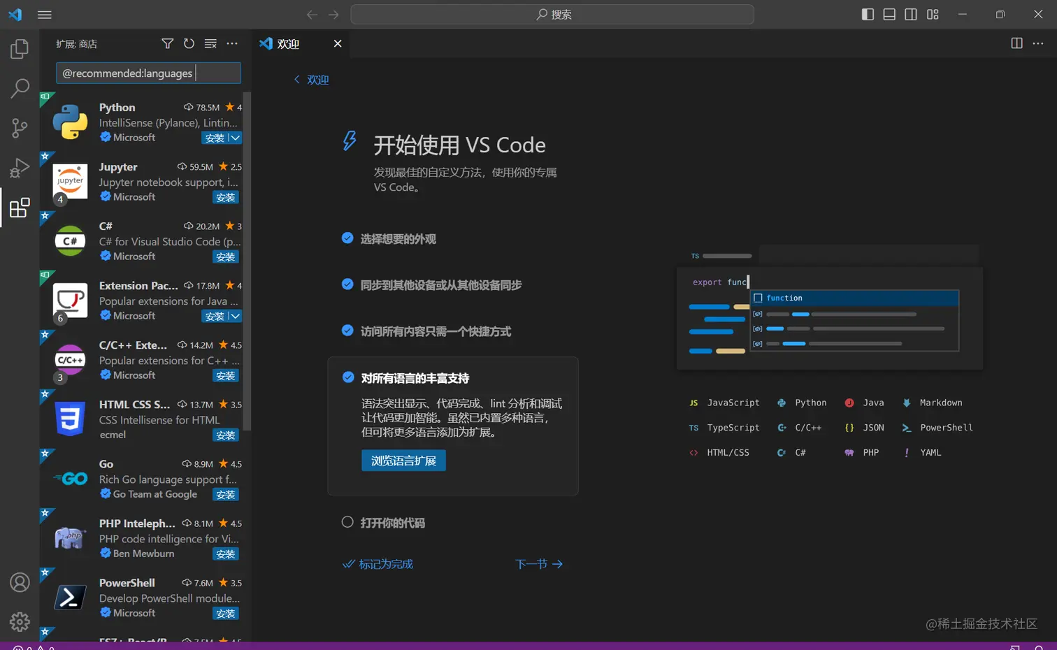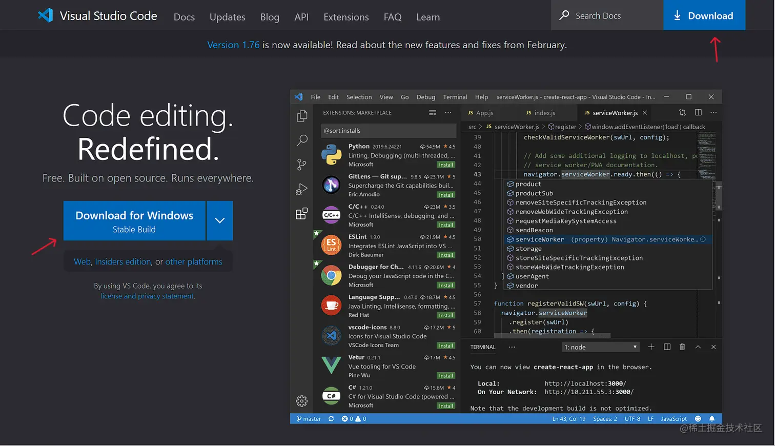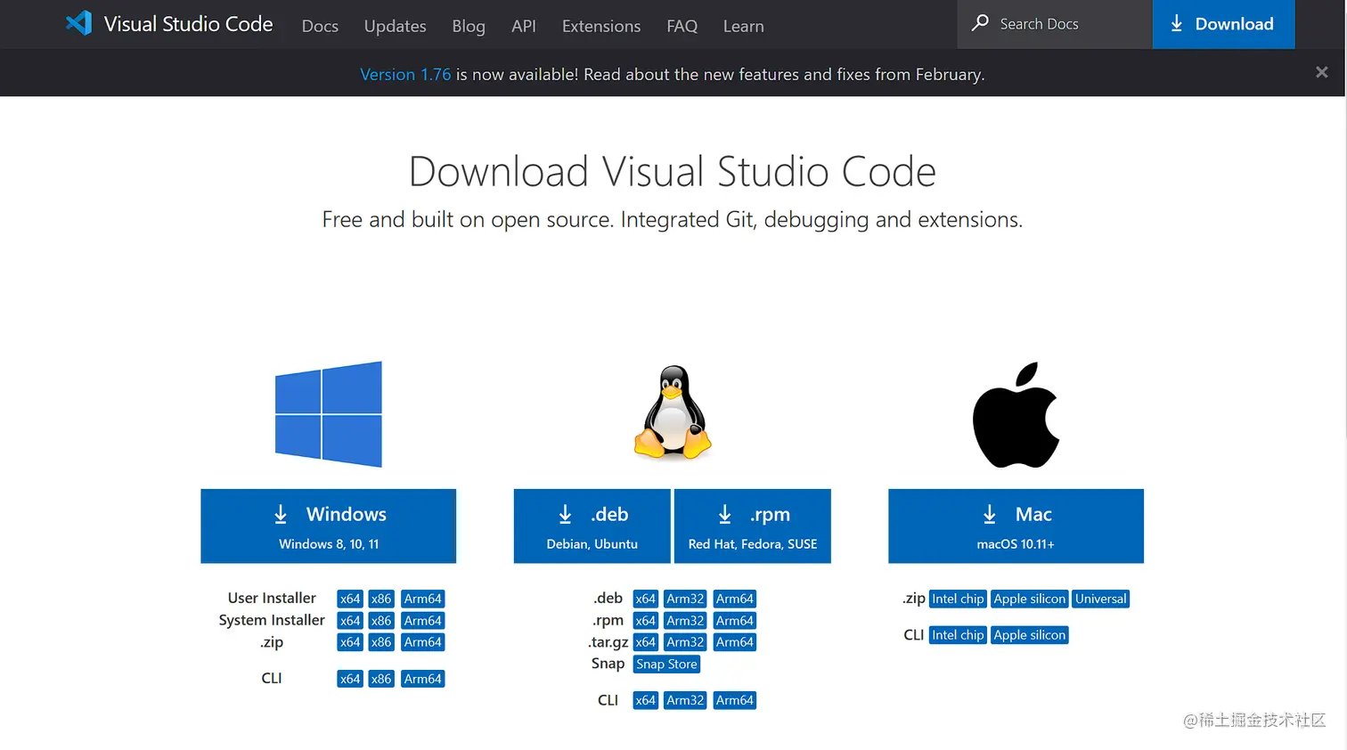 VSCode 是一款由微软开发且跨平台的免费源代码编辑器;该软件支持语法高亮、代码自动补全、代码重构、查看定义功能,并且内置了命令行工具和 Git 版本控制系统。