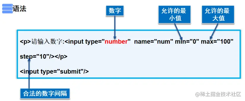 <p>请输入数字:<input type="number" name="num" min="0" max="100" step="10"/></p>