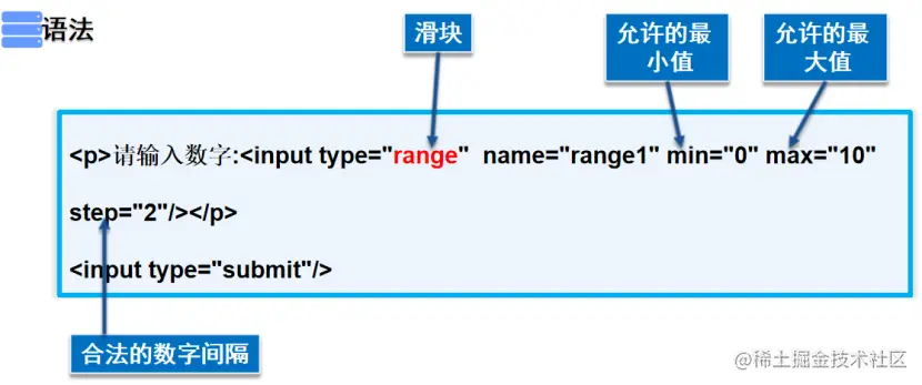 <p>请输入数字:<input type="range" name="range1" min="0" max="10" step="2"/></p>