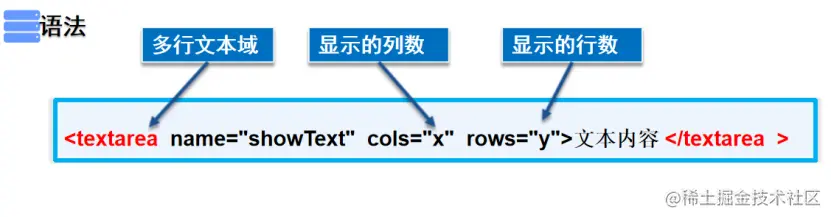 <textarea name="showText" cols="x" rows="y">文本内容 </textarea >