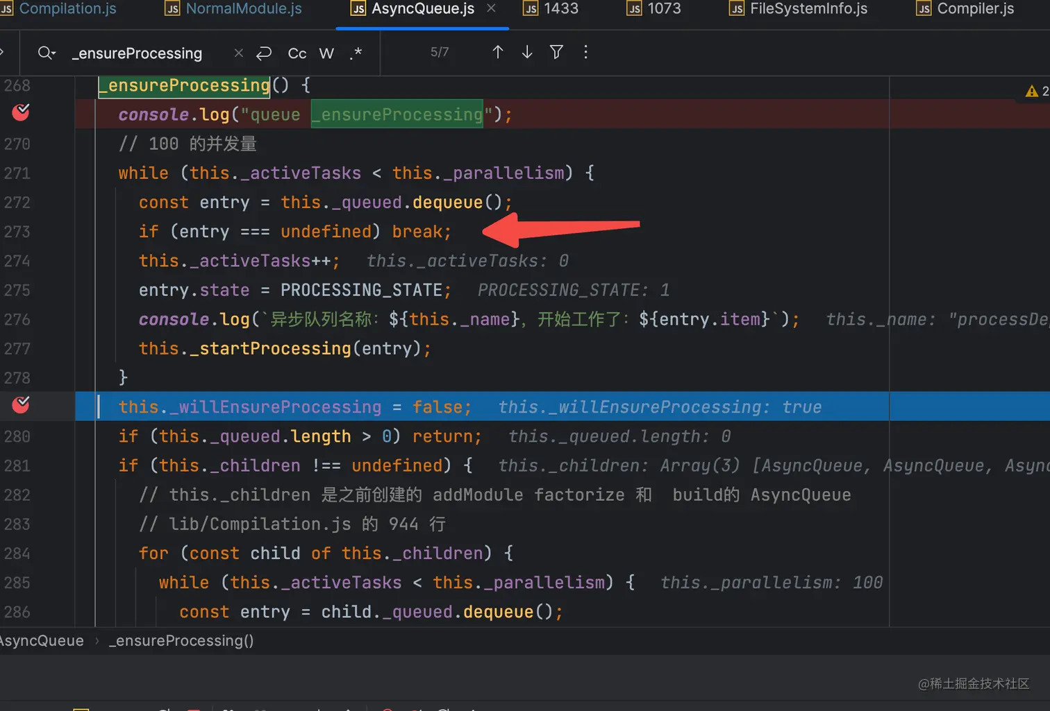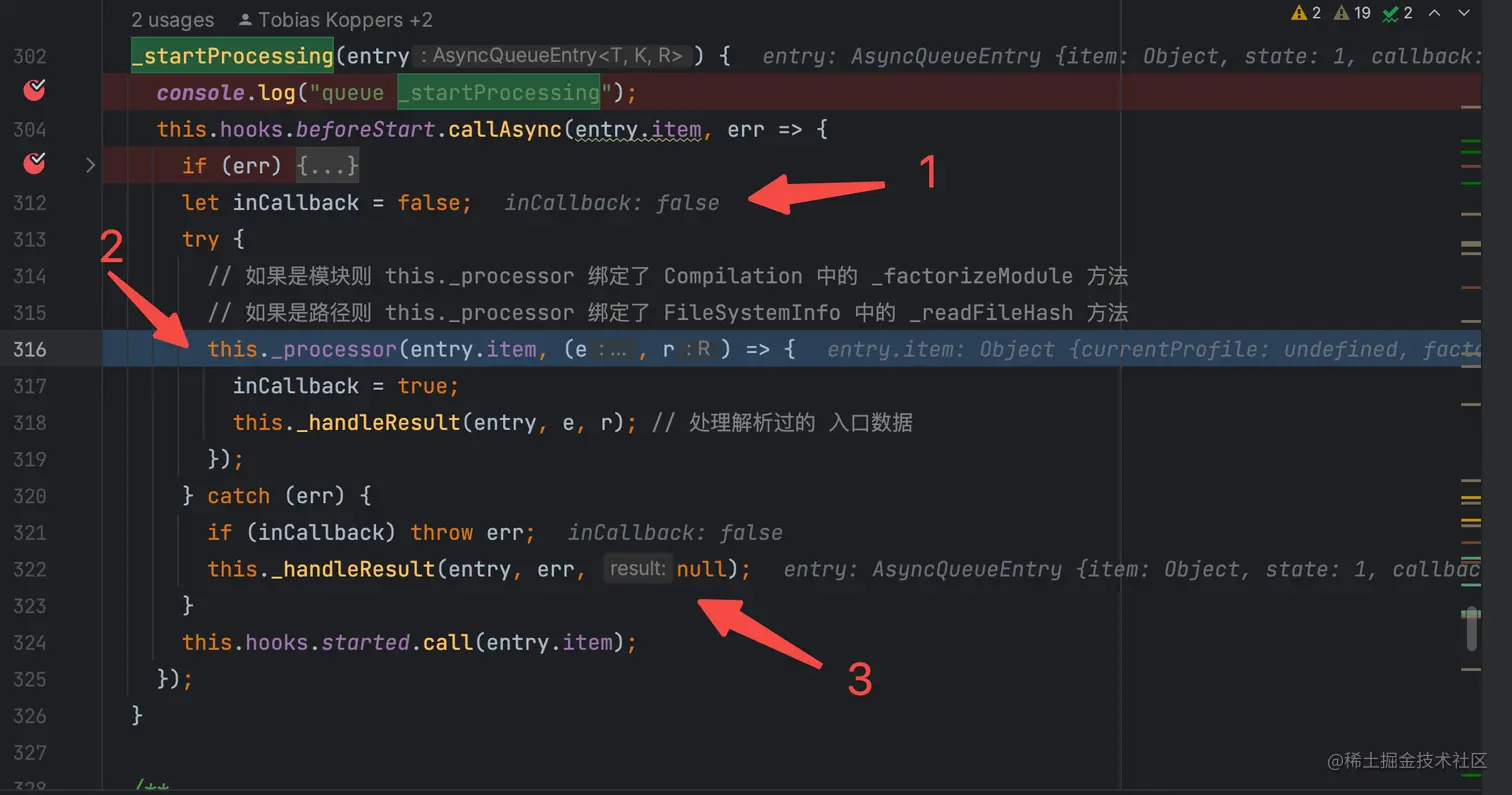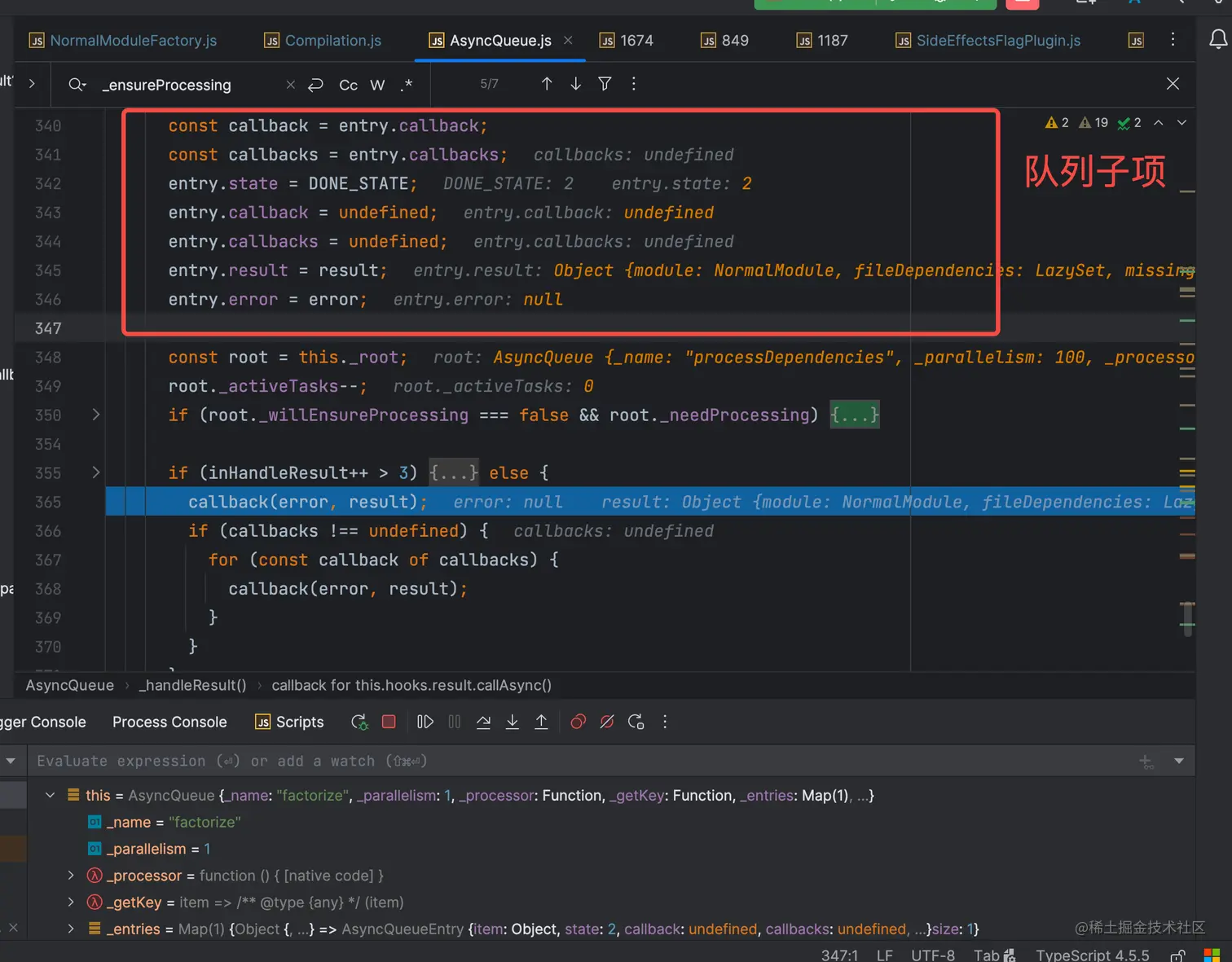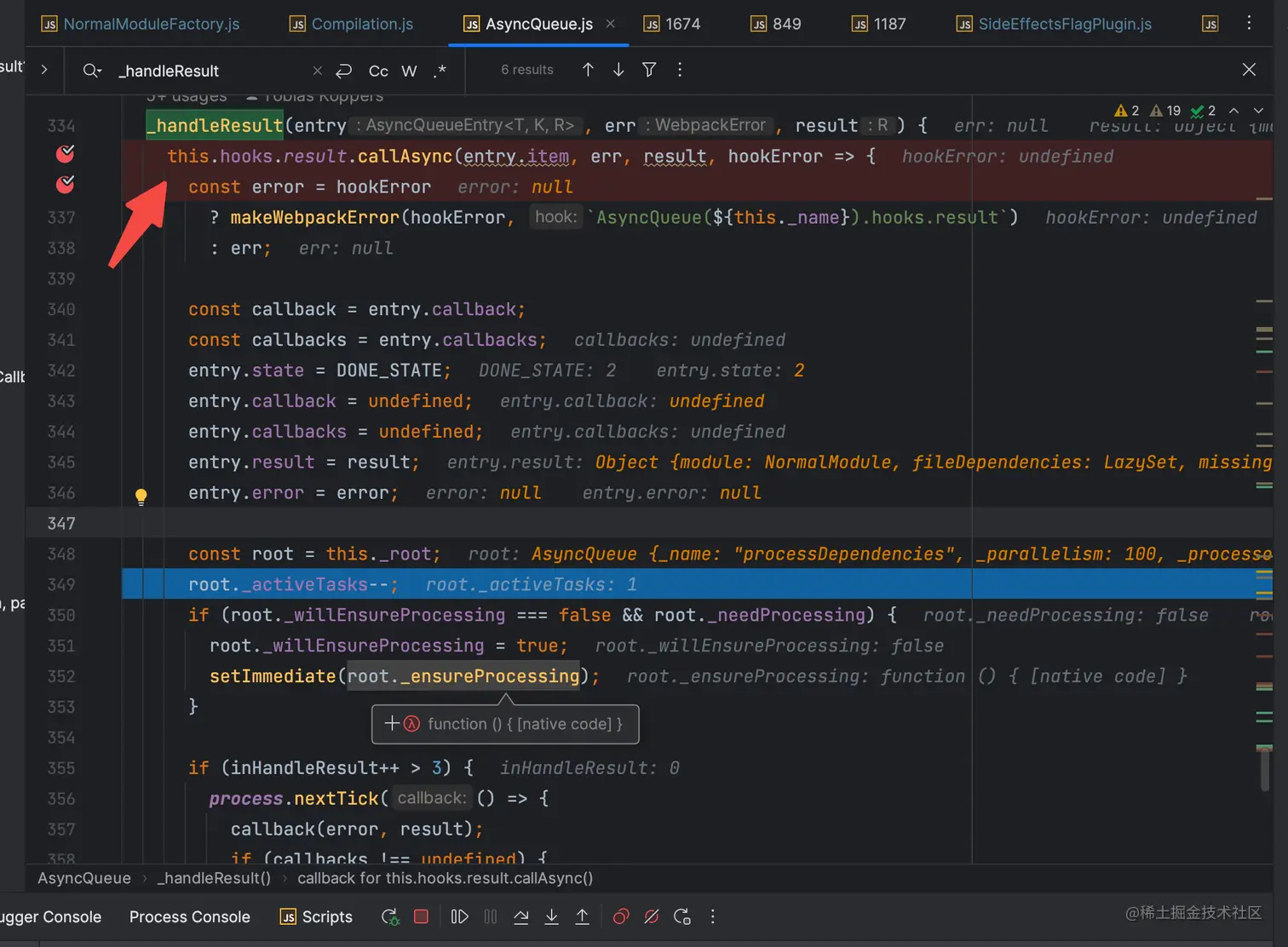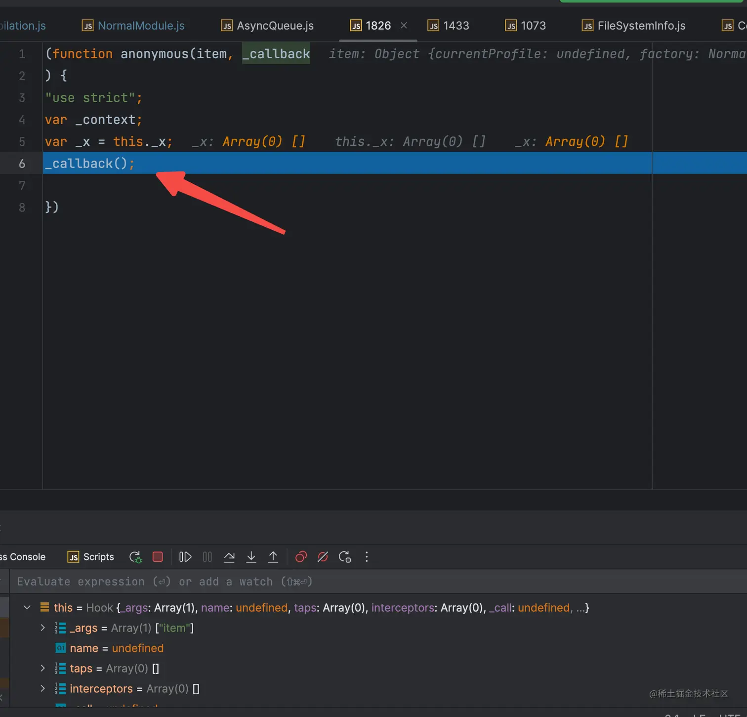 继续调试下去,执行callback(error, result);,此处的 callback是从 AsyncQueueEntry身上取到的。回想一下这里的 callback的来源是哪里?