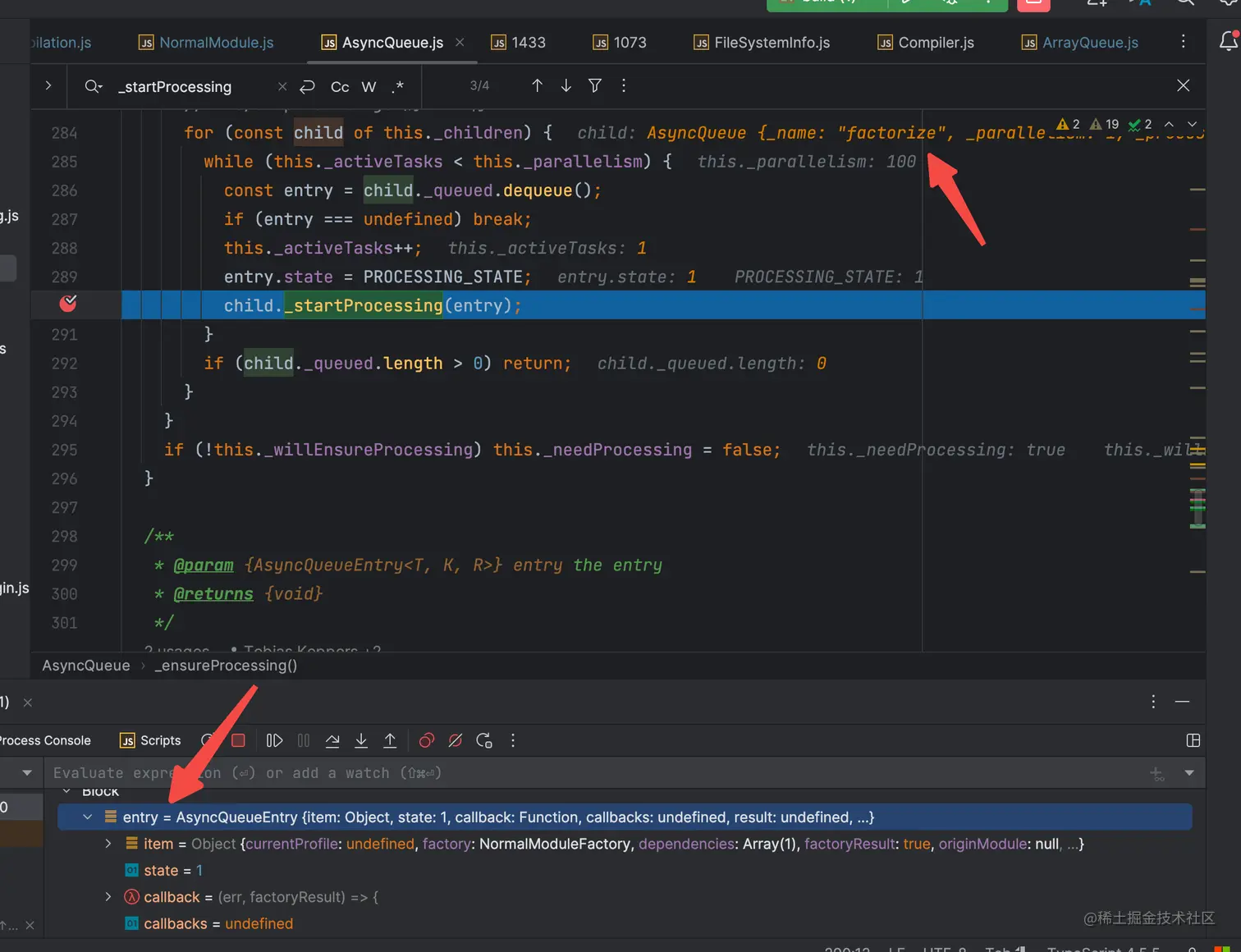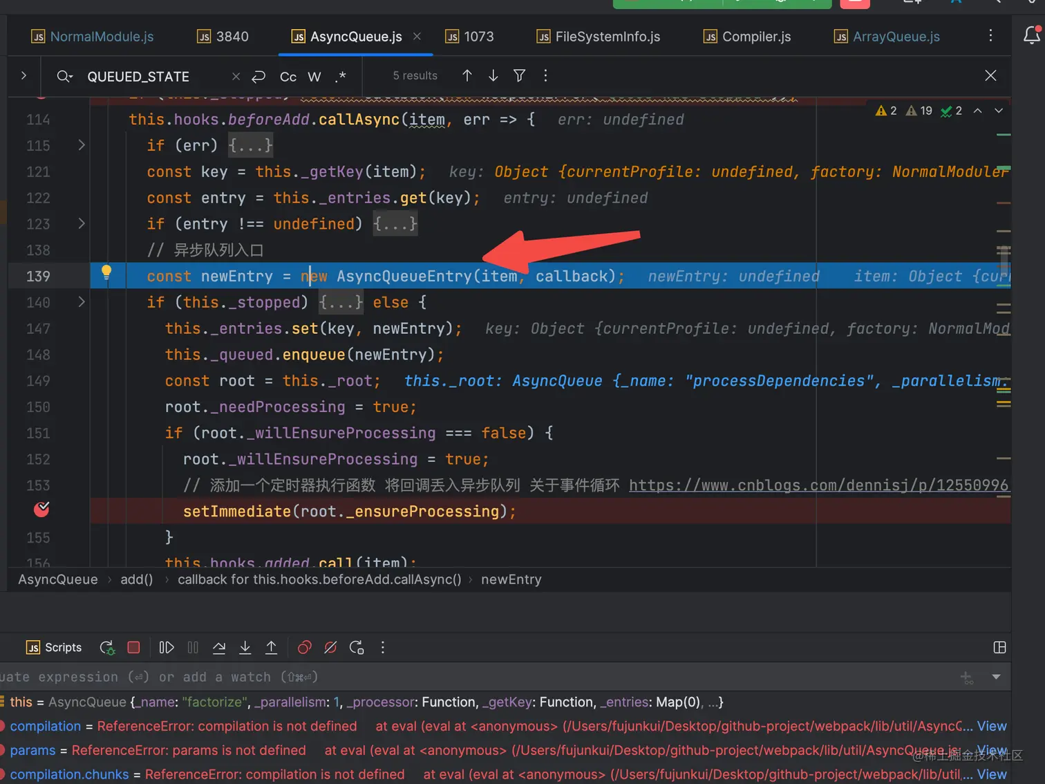 - this.factorizeQueue 中的 root 指向的是 this.addModuleQueue. root,而 this.addModuleQueue._root 指向的是 processDependenciesQueue