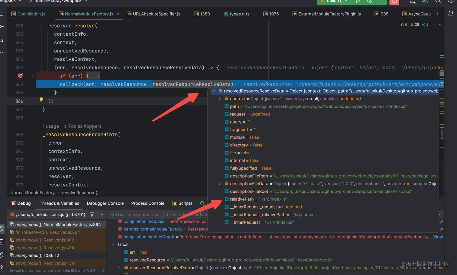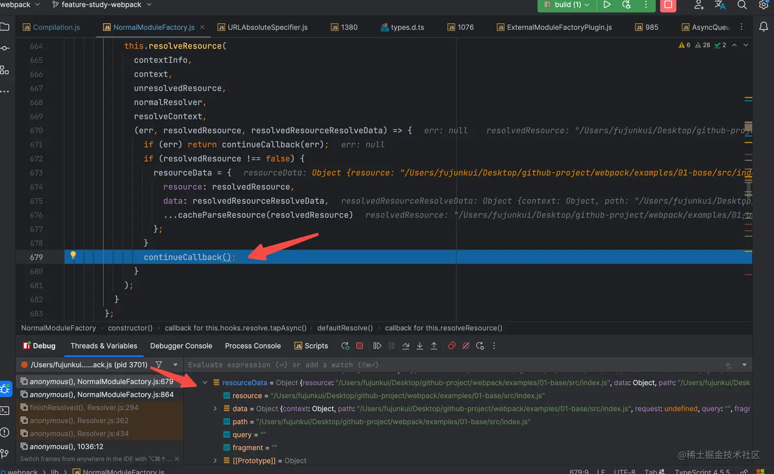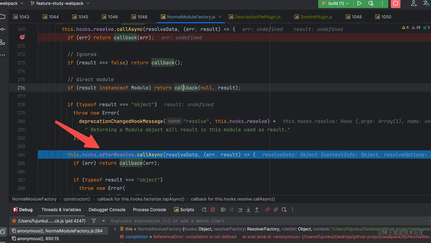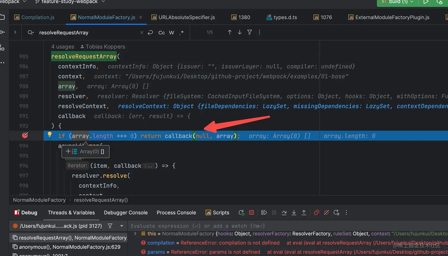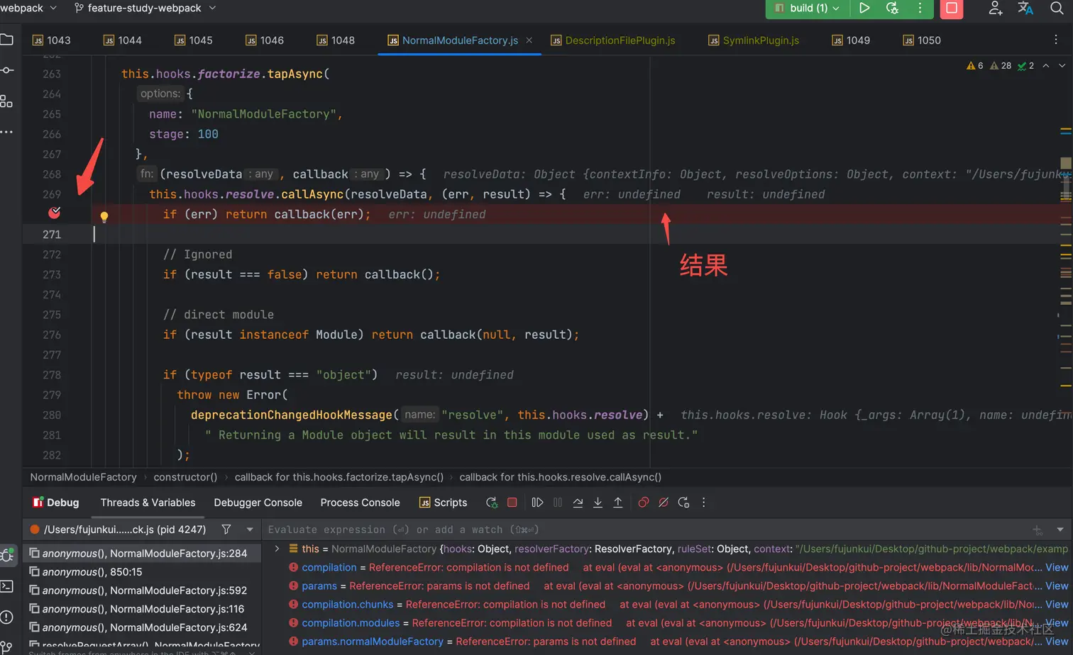 关于此函数,内容有些多,此处就不做进行解析了。直接断点回到刚刚的 this.hooks.resolve.callAsync的部分。在其 callback 内部打上断点。