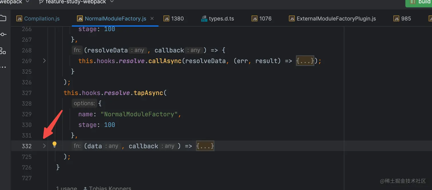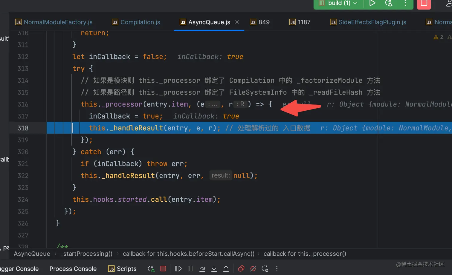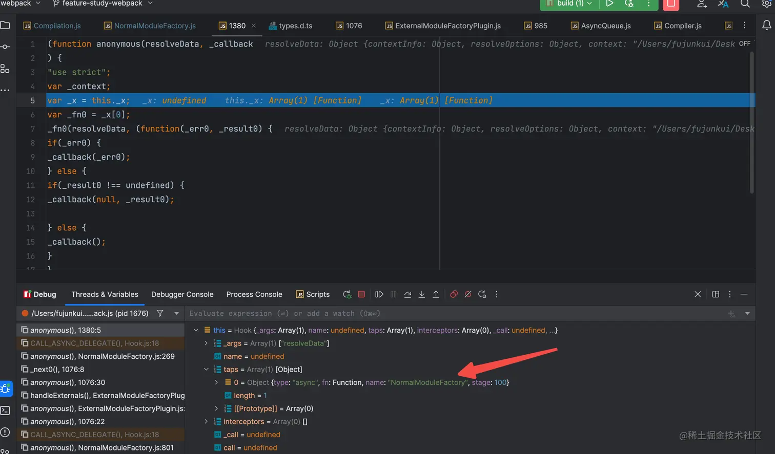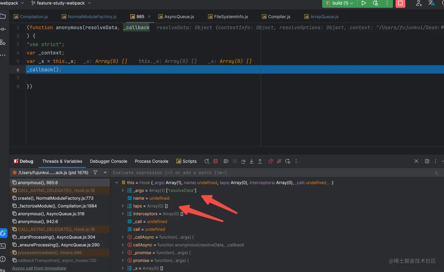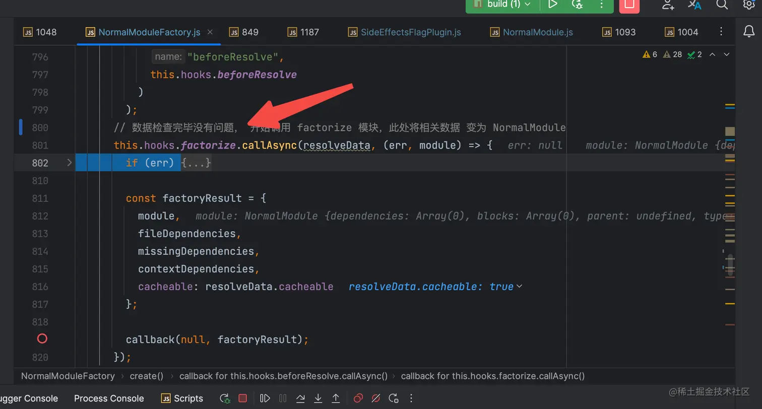关于此函数,内容有些多,此处就不做进行解析了。直接断点回到刚刚的 this.hooks.resolve.callAsync的部分。在其 callback 内部打上断点。