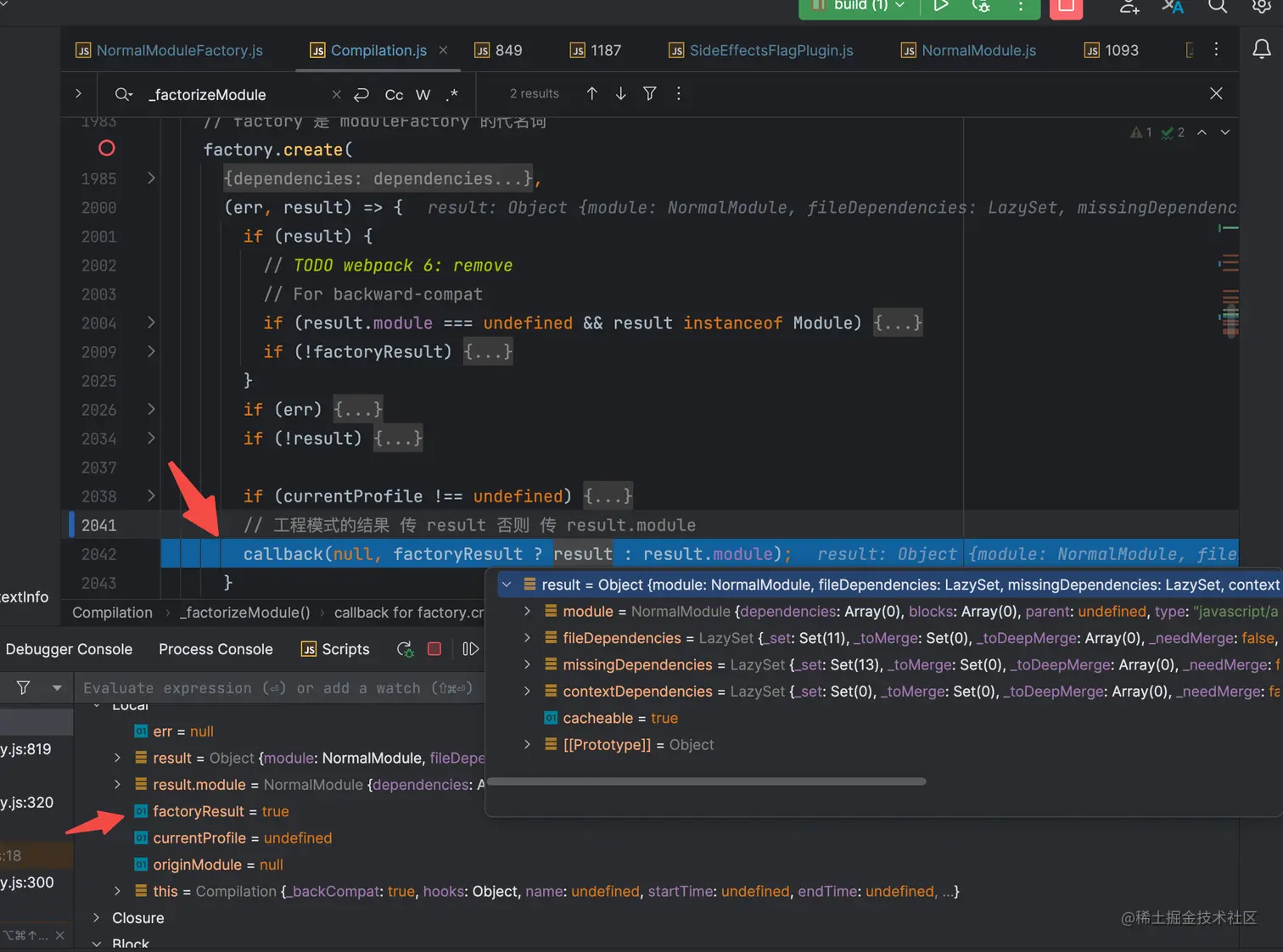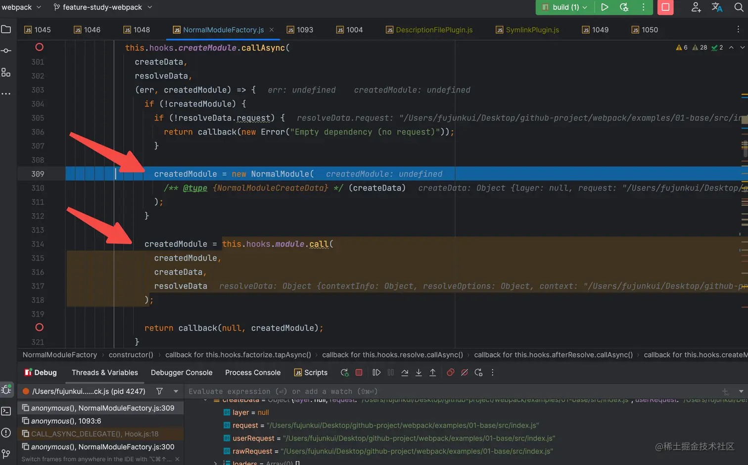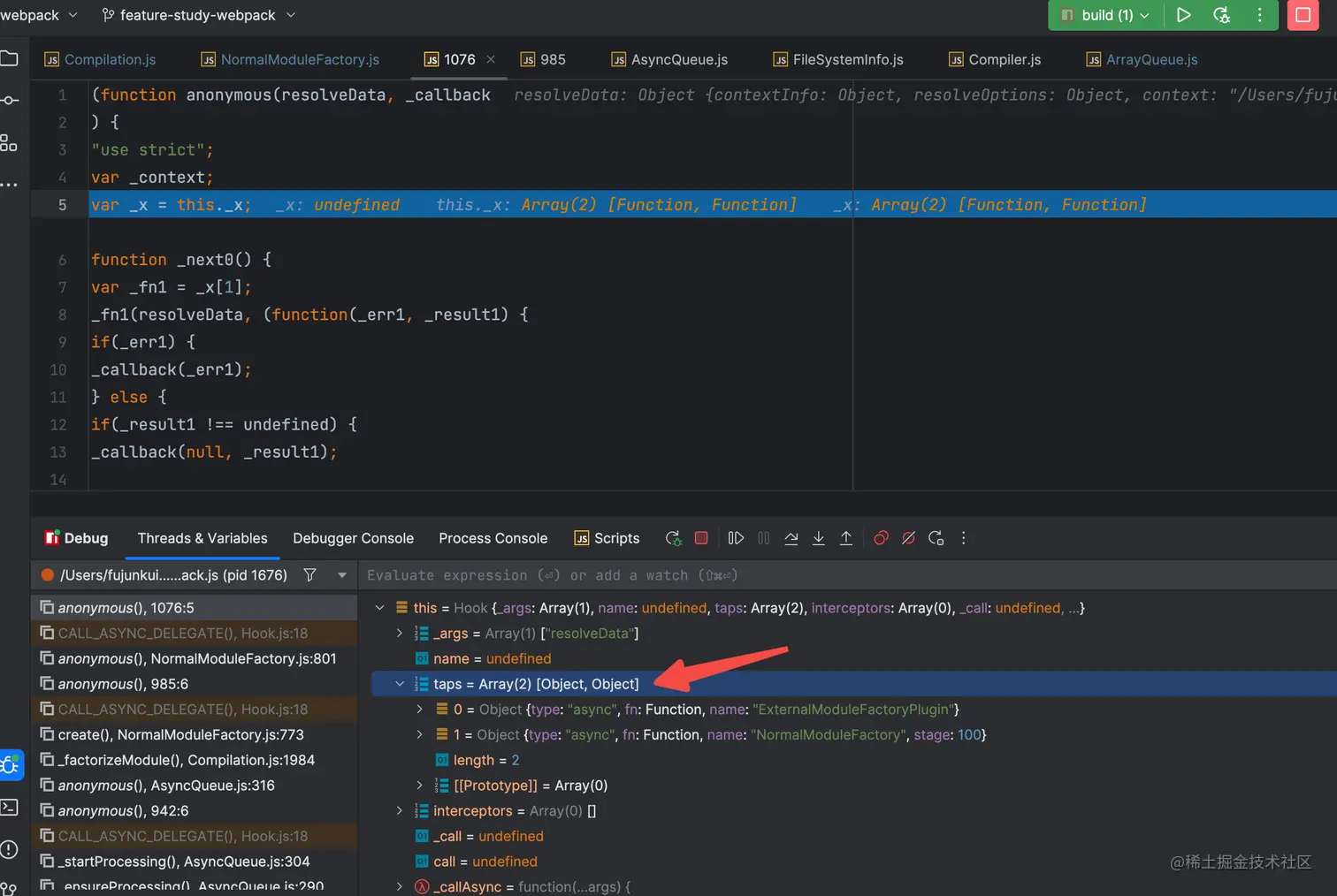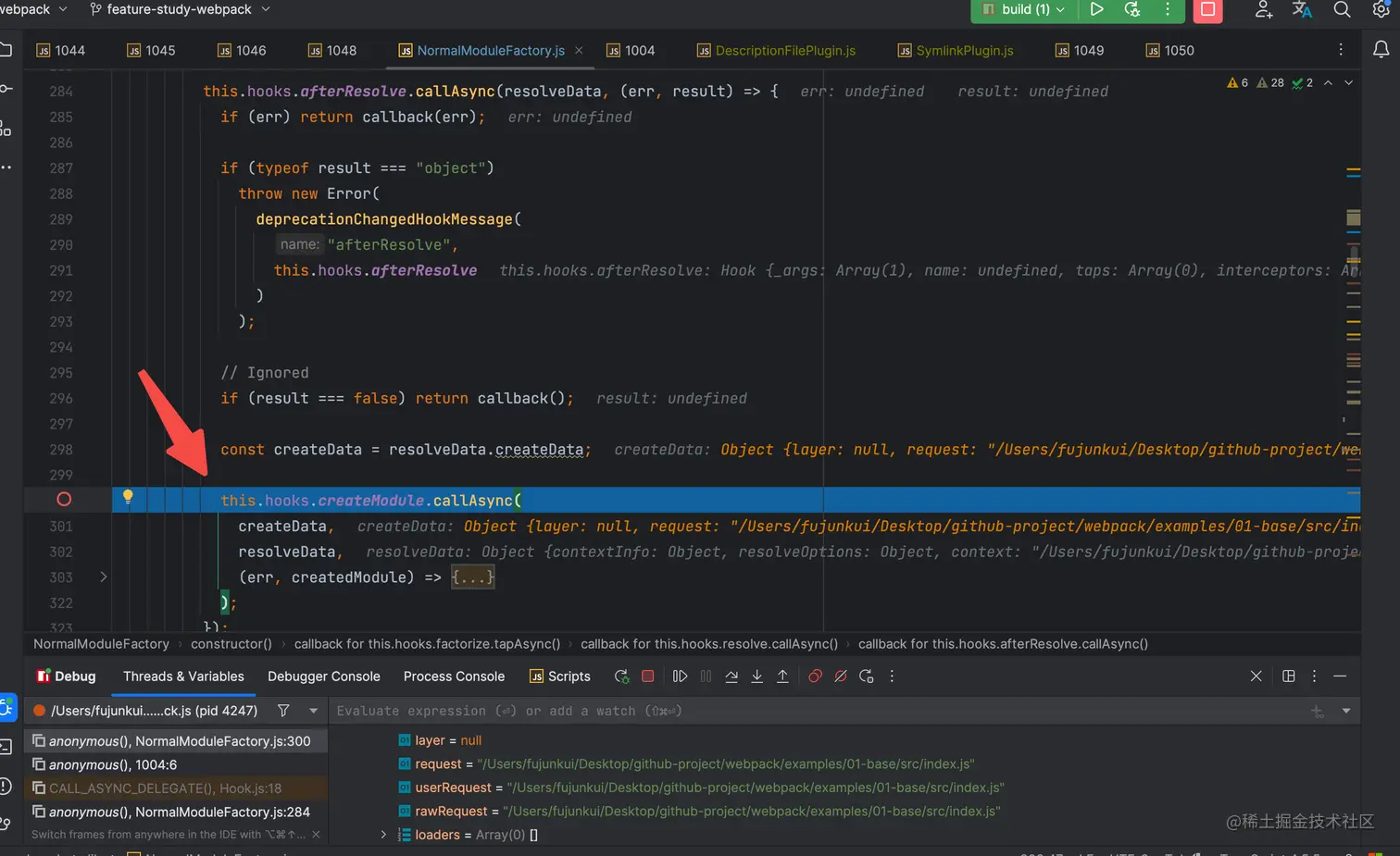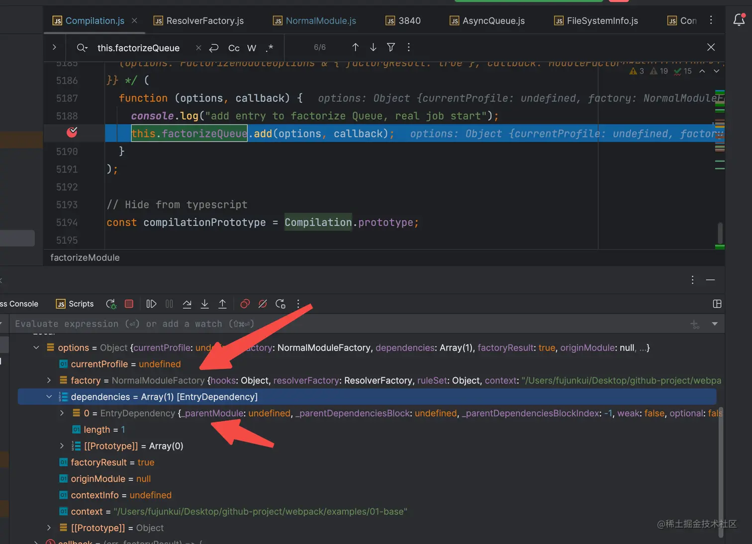 关于此函数,内容有些多,此处就不做进行解析了。直接断点回到刚刚的 this.hooks.resolve.callAsync的部分。在其 callback 内部打上断点。