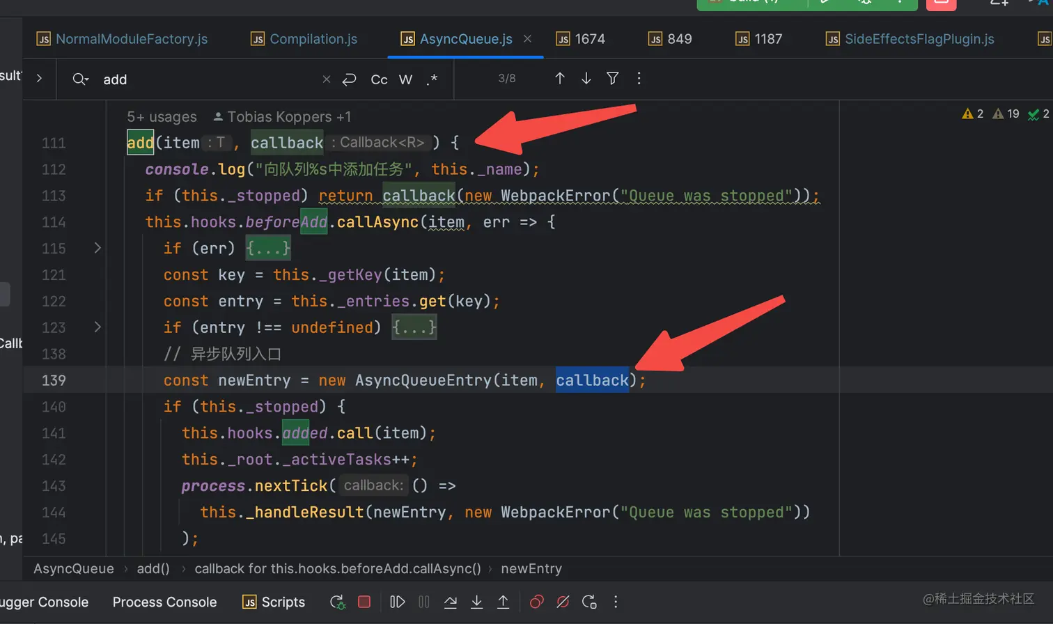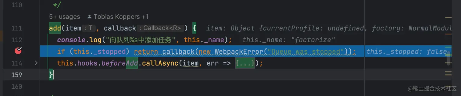 大致的逻辑就是 判断一下 this._stopped 当前的实例队列是不是暂停的状态,是暂停的状态就 直接 callback 抛出错误。 那核心的步骤就在 this.hooks.beforeAdd.callAsync这个hook了,老规矩,debug 这个 hook 看一下有哪些 监听者。