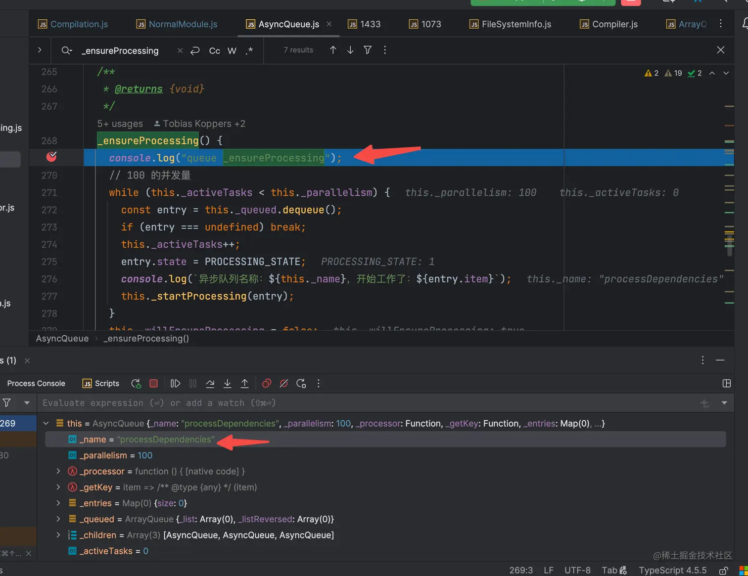 - this.buildQueue 中的 root 指向的是 this.factorizeQueue. root,而 this.factorizeQueue._root 指向的是 processDependenciesQueue