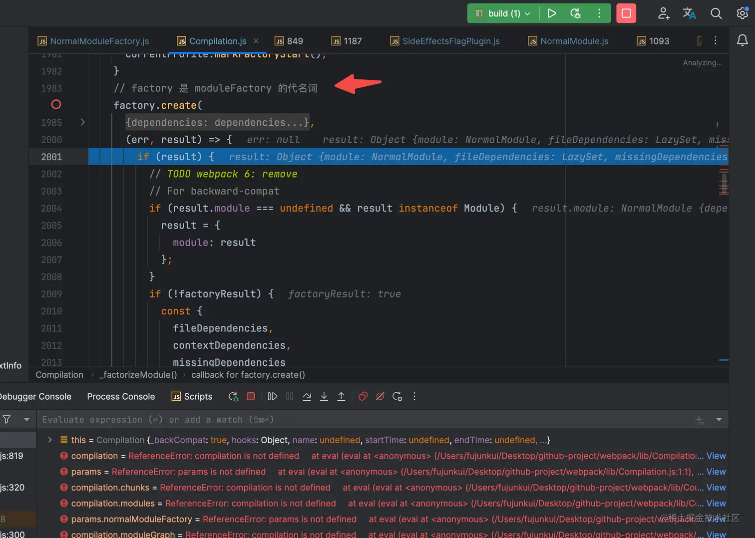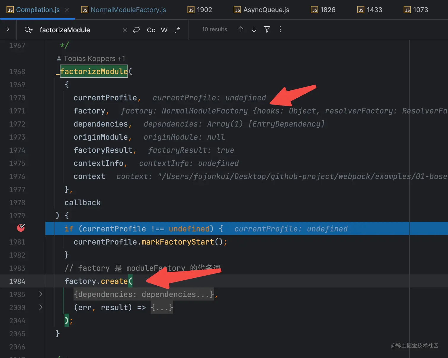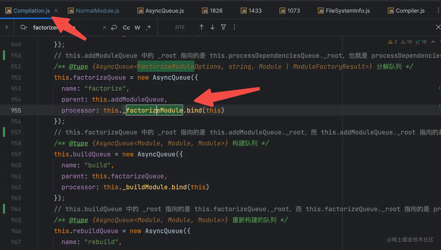 那么 这个 this.factorizeQueue 指的是什么呢?谁来创建的呢?首先此处的this 指的是 Compilation 的 实例对象,那就去 Compilation 查找,全局搜索一下 Compilation.js 文件,找到了,代码如下(中文注释是我加的):