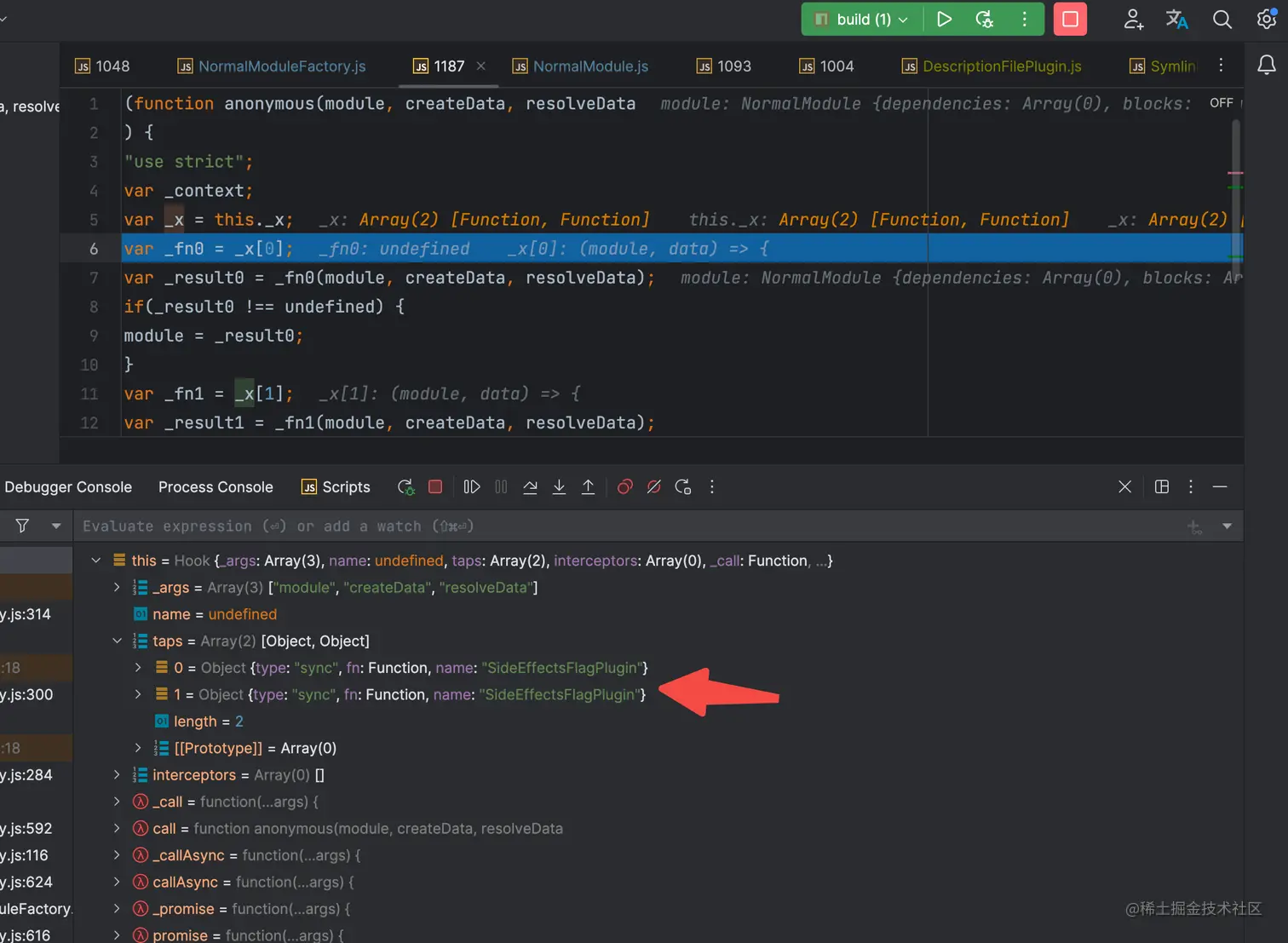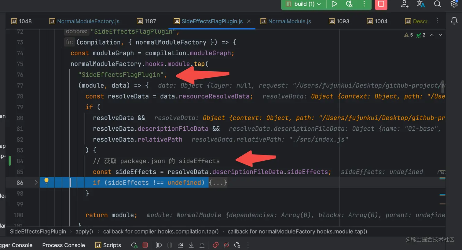 至于Module 对象 不是本章的重点,这里只需要明白 路径代表的文件变为了 Module对象 即可。 然后继续向下执行,调用 module的hook。直接看注册此hook的SideEffectsFlagPlugin插件。