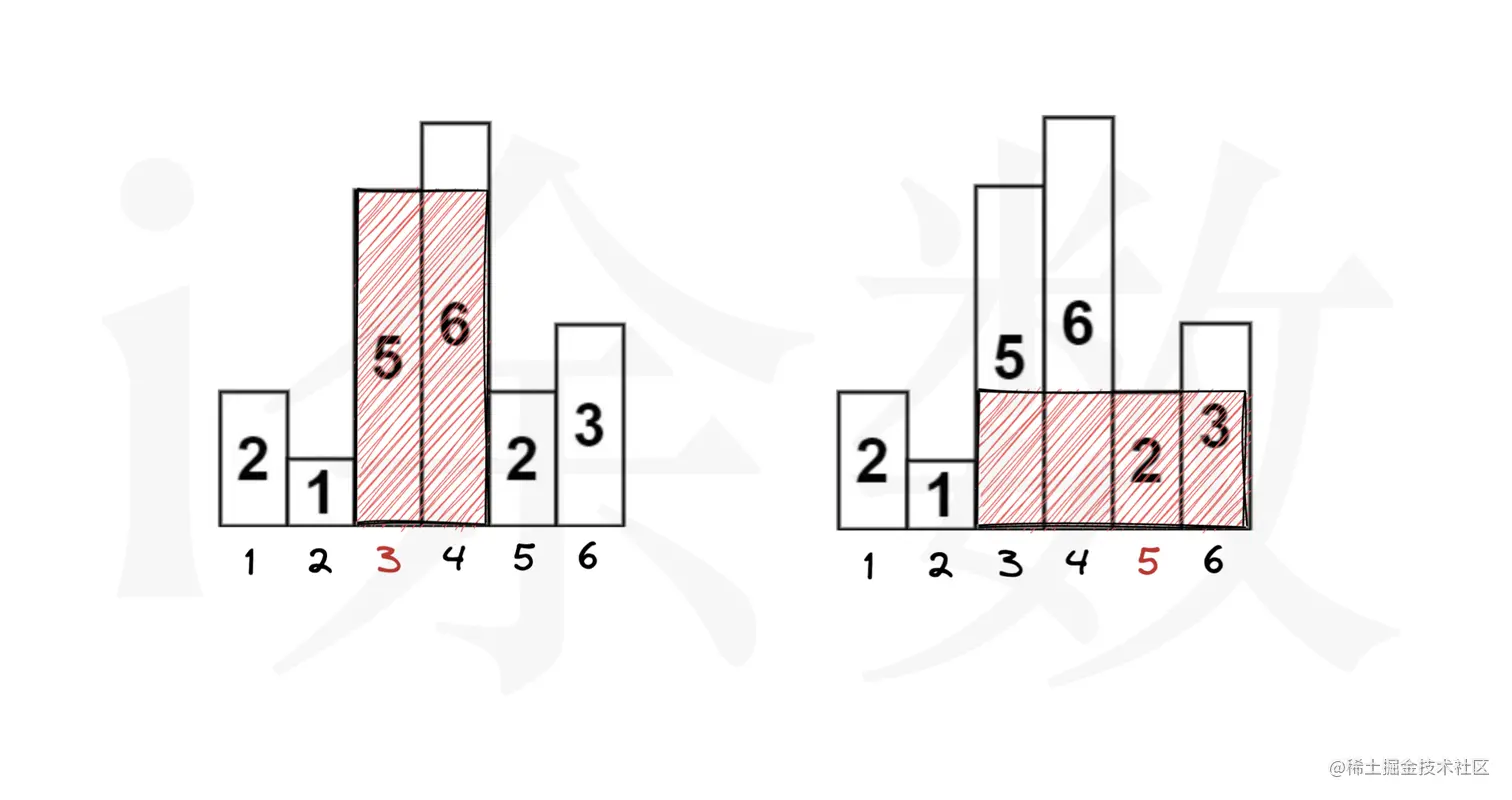 第 3 个柱子左边界 left = 3, 右边界 right = 4,高度 height = 5,能够勾勒出的最大矩形面积为 (4 - 3 + 1)* 5 = 10。