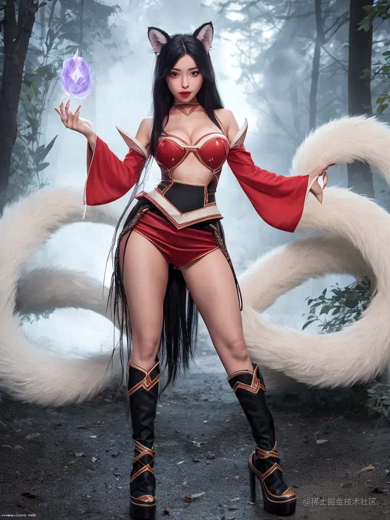 prompt:(8k, RAW photo:1.2),best quality, ultra high res, ahri, ahri_(league_of_legends), 1girl, absurdres, animal_ears, black_hair, breasts, detached_sleeves, distr, highres, facial_mark, fox_ears, fox_tail, hand_up, league_of_legends, long_hair, long_sleeves, magic, multiple_tails, orange_eyes, parted_lips, solo, standing, tail, full body lora:Ahri:0.6 lora:KoreanDollLikeness:0.3 Negative prompt: (painting by bad-artist-anime:0.9), (painting by bad-artist:0.9), watermark, text, error, blurry, jpeg artifacts, cropped, worst quality, low quality, normal quality, jpeg artifacts, signature, watermark, username, artist name, (worst quality, low quality:1.4), bad anatomy