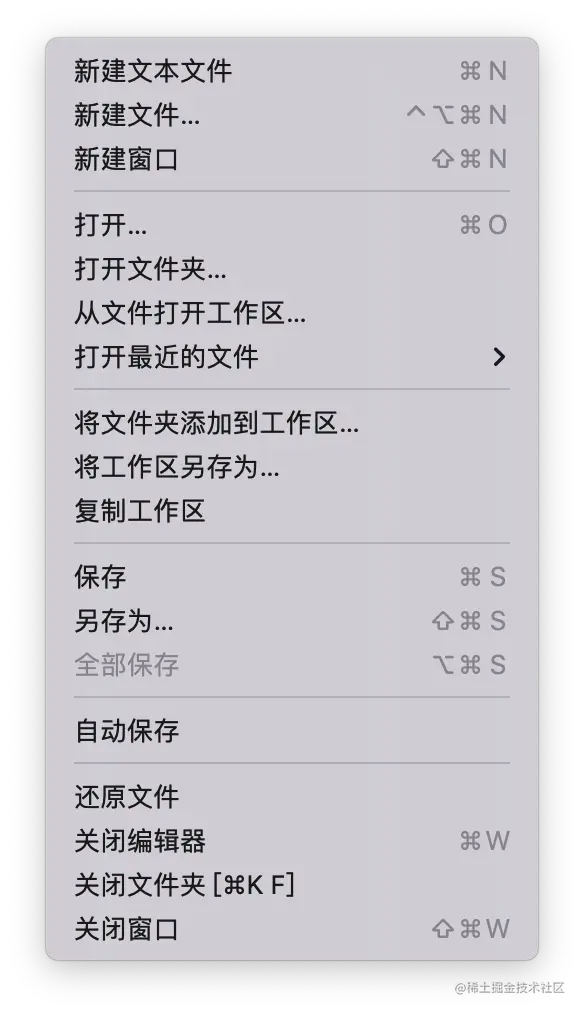 与全局快捷键不同,窗口快捷键是当窗口处于激活状态时,按下按键之后触发的行为。例如我们打开 word 或 photoshop 软件,可以用 ctrl + z 撤销上一步操作,用 ctrl + c 复制等。下图是 vscode 的菜单和对应的快捷键: