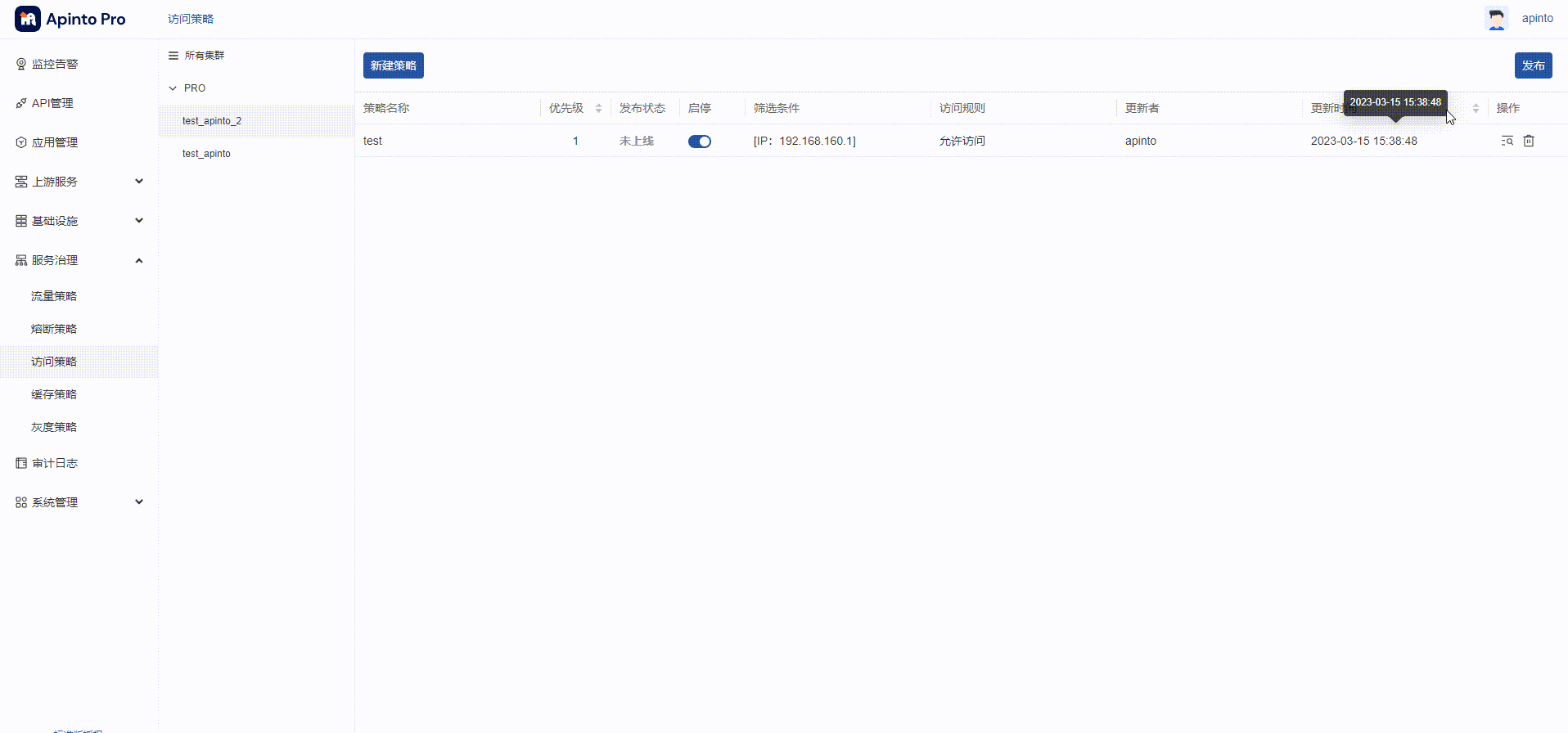 公司要求配置IP黑白名单,看了一下Apinto官网介绍,服务治理的访问策略可配置IP黑白名单。