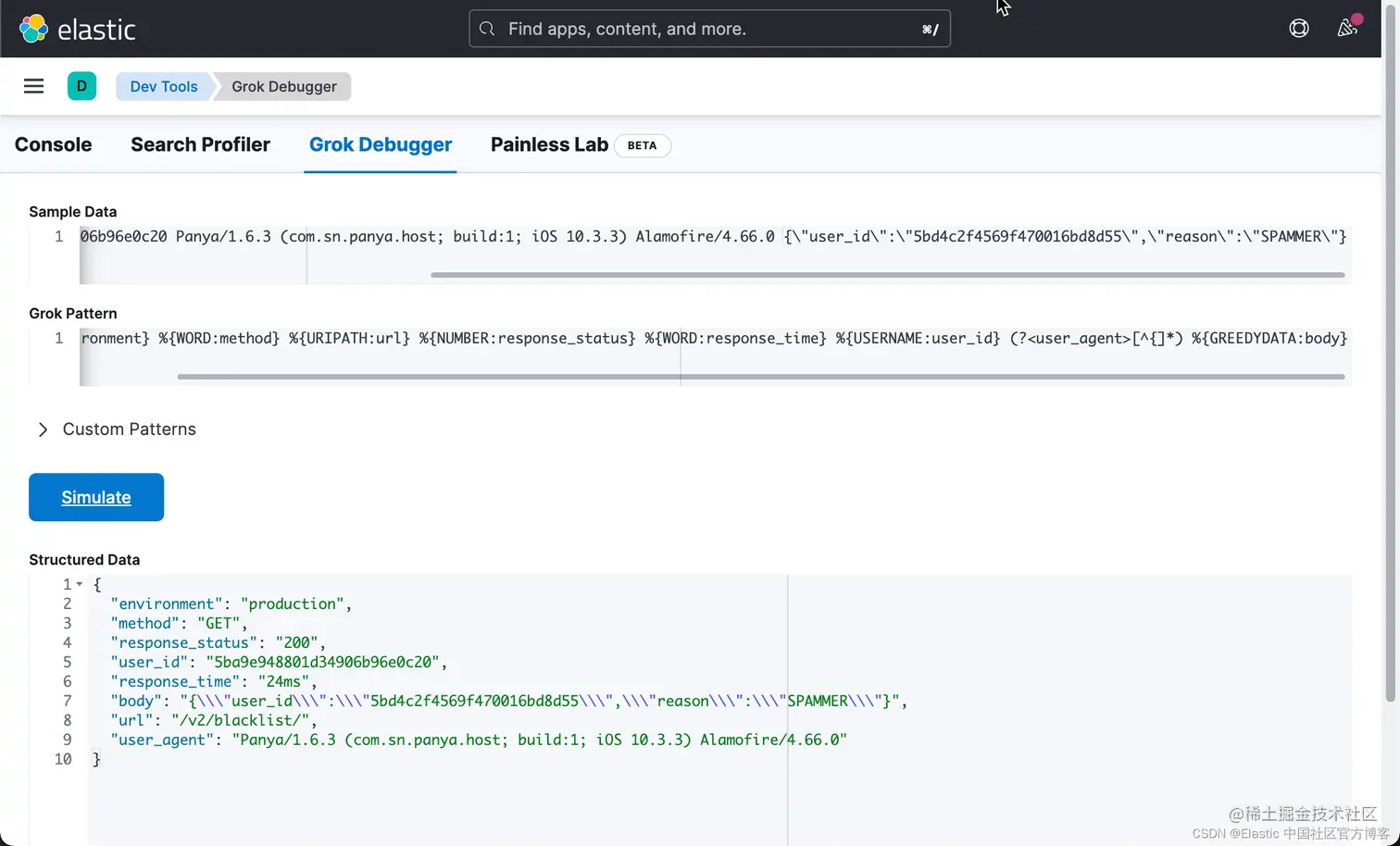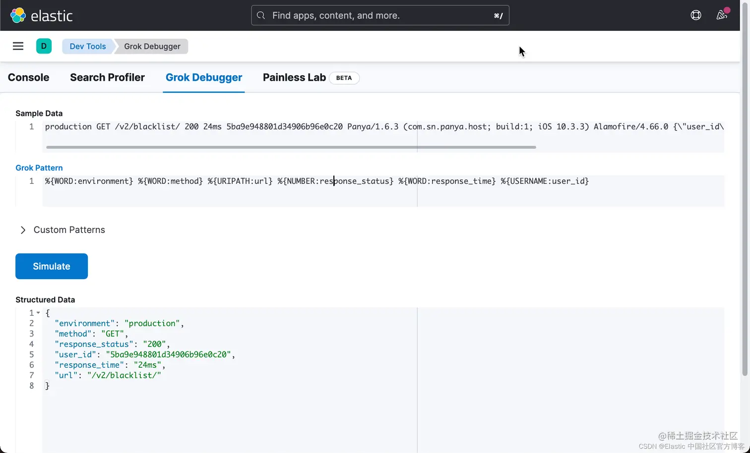 目标是找到一种模式来构造非结构化日志数据。为此,我们将使用 Kibana 里的 Grok Debugger 来进行测试: