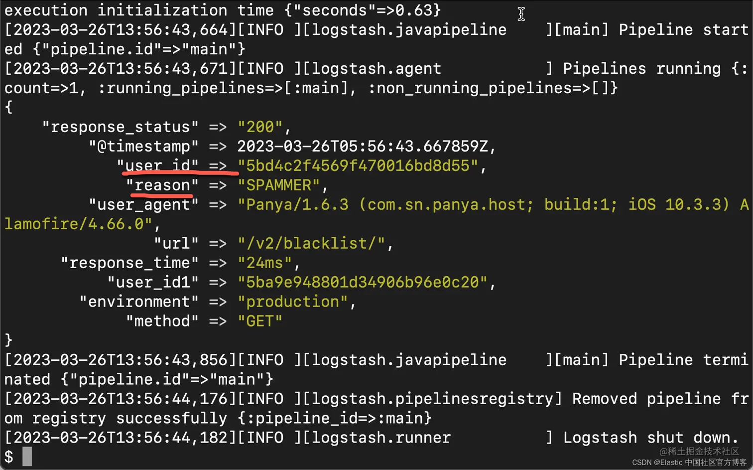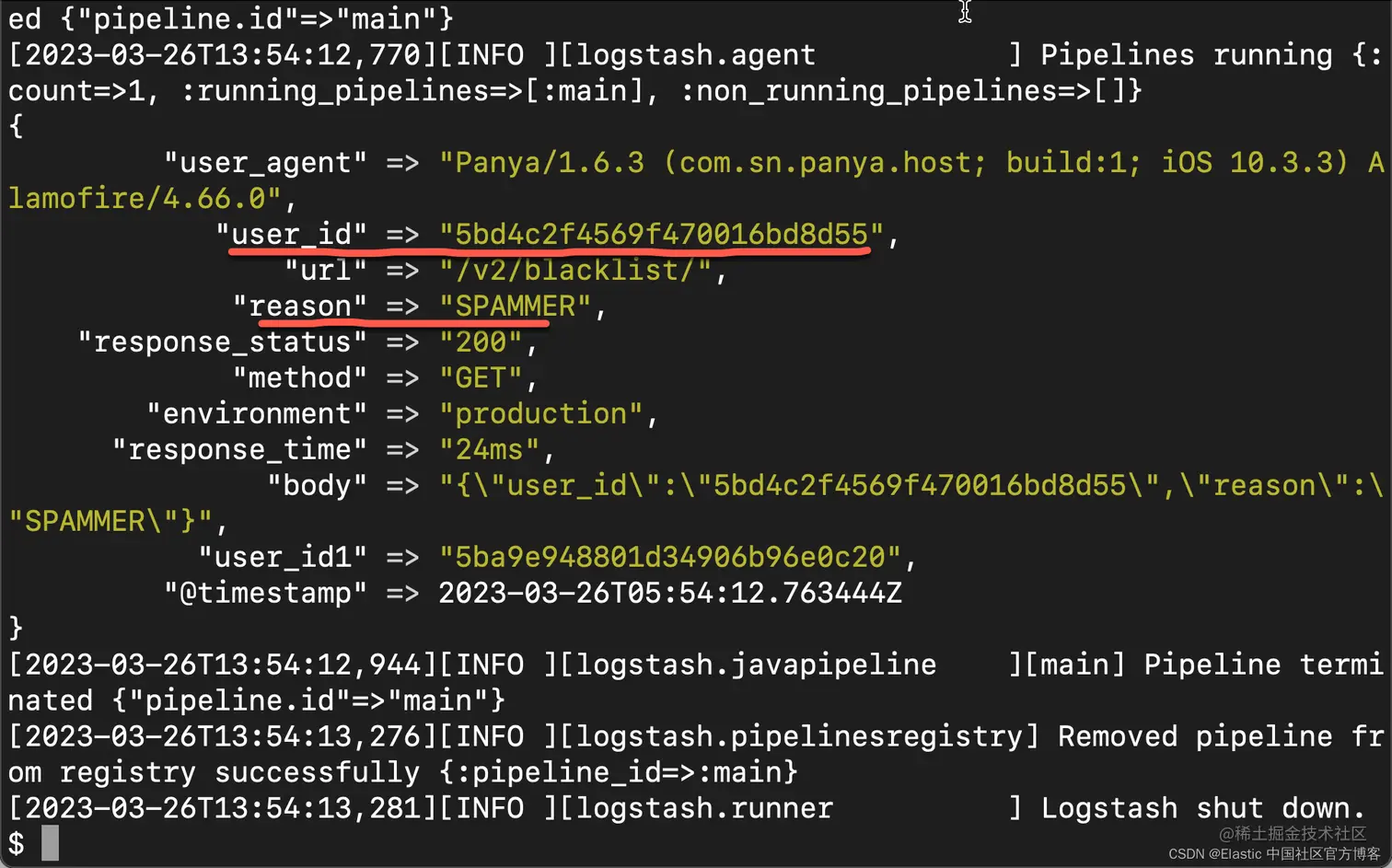 3. message => 'production GET /v2/blacklist/ 200 24ms 5ba9e948801d34906b96e0c20 Panya/1.6.3 (com.sn.panya.host; build:1; iOS 10.3.3) Alamofire/4.66.0 {"user_id":"5bd4c2f4569f470016bd8d55","reason":"SPAMMER"}'