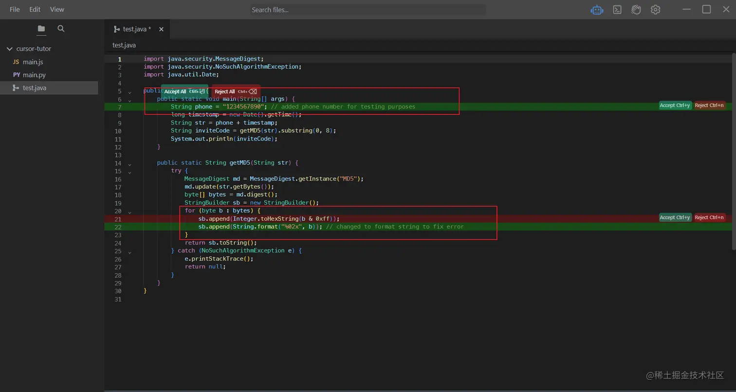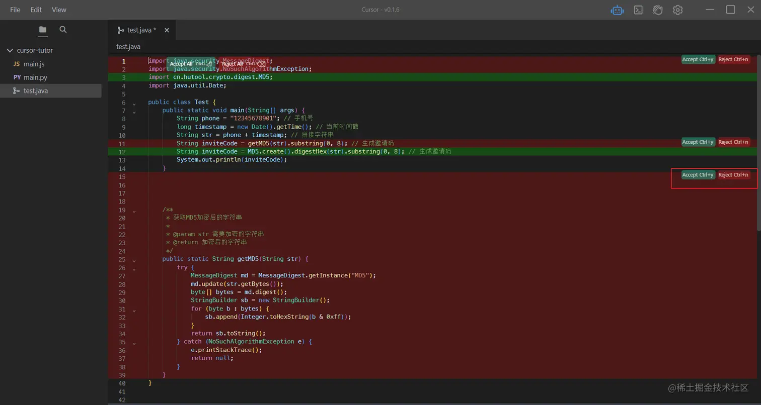 我们再用Ctrl+K问他一下。然后他会一行一行的读取我们的代码,给出修改的意见。Accept接受就Ctrl+y,拒绝就Ctrl+n。这不妥妥的提供工作效率嘛。