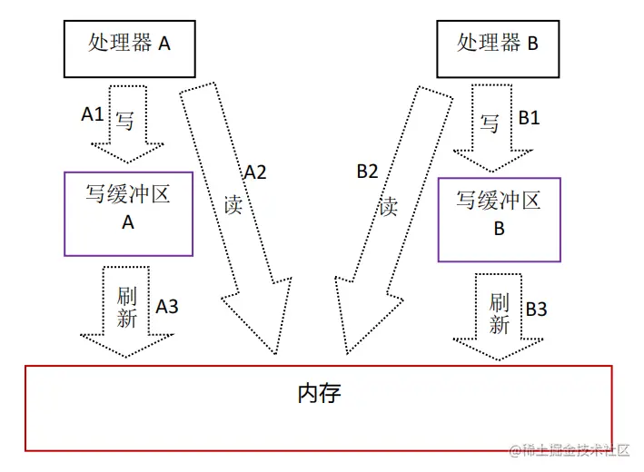 - 处理器A和处理器B可以同时把共享变量写入自己的写缓冲区(A1,B1)