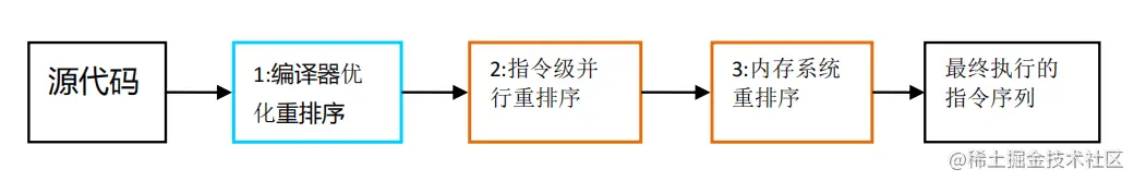 基于上述所说的场景之下,JVM为了在执行程序时为了提高性能,编译器和处理器常常会对指令做重排序。在此我们将按照重排序的执行时间前后分为重排序分三种类型,如下图所示。