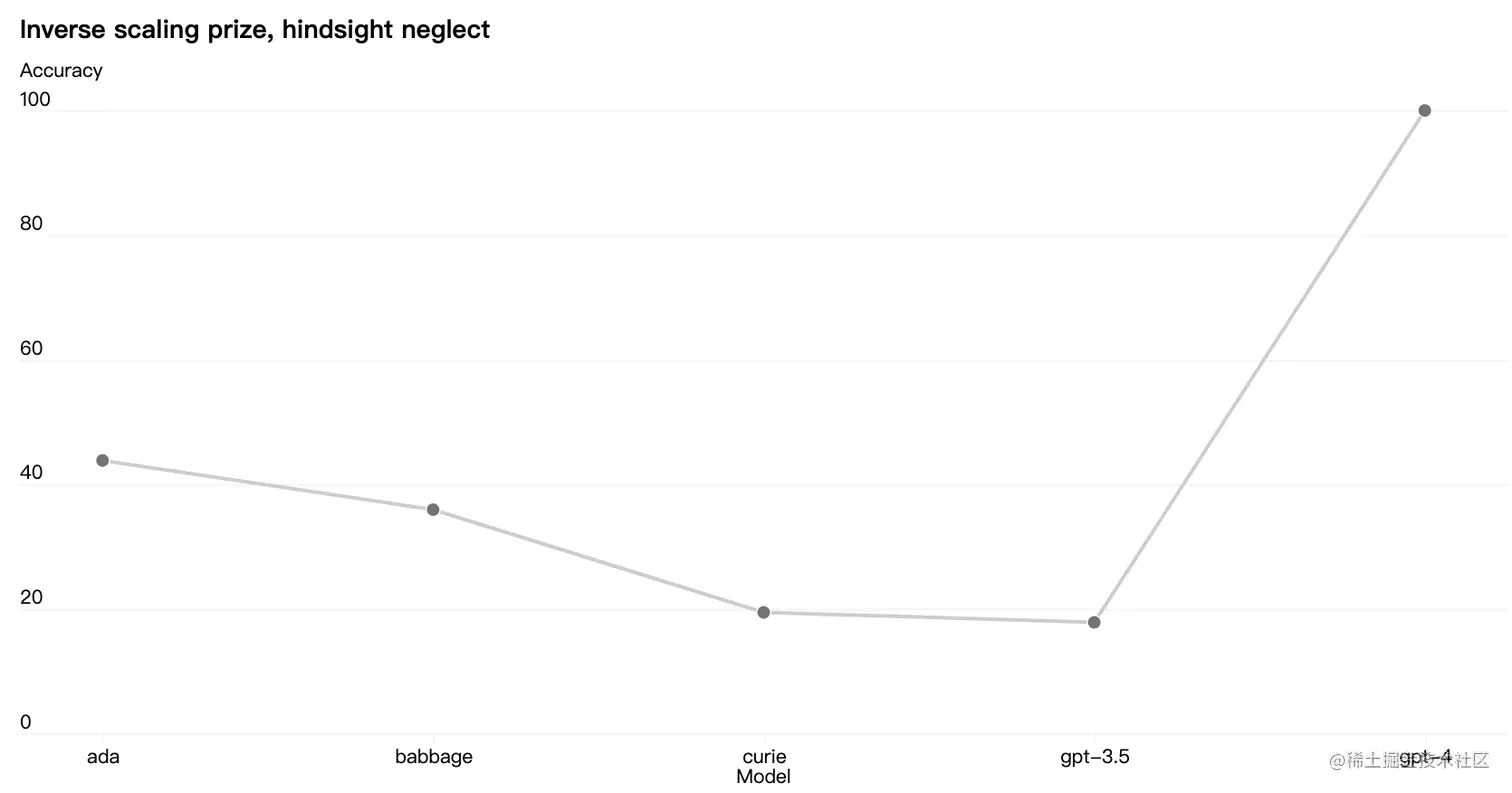 有些能力难以预测,例如Inverse Scaling Prize 是一项竞赛,目标是寻找一个随着模型计算量的增加而变得更糟的指标,hindsight neglect 任务是赢家之一,这个任务此任务测试语言模型是否能够根据预期值评估赌注是否值得。例如