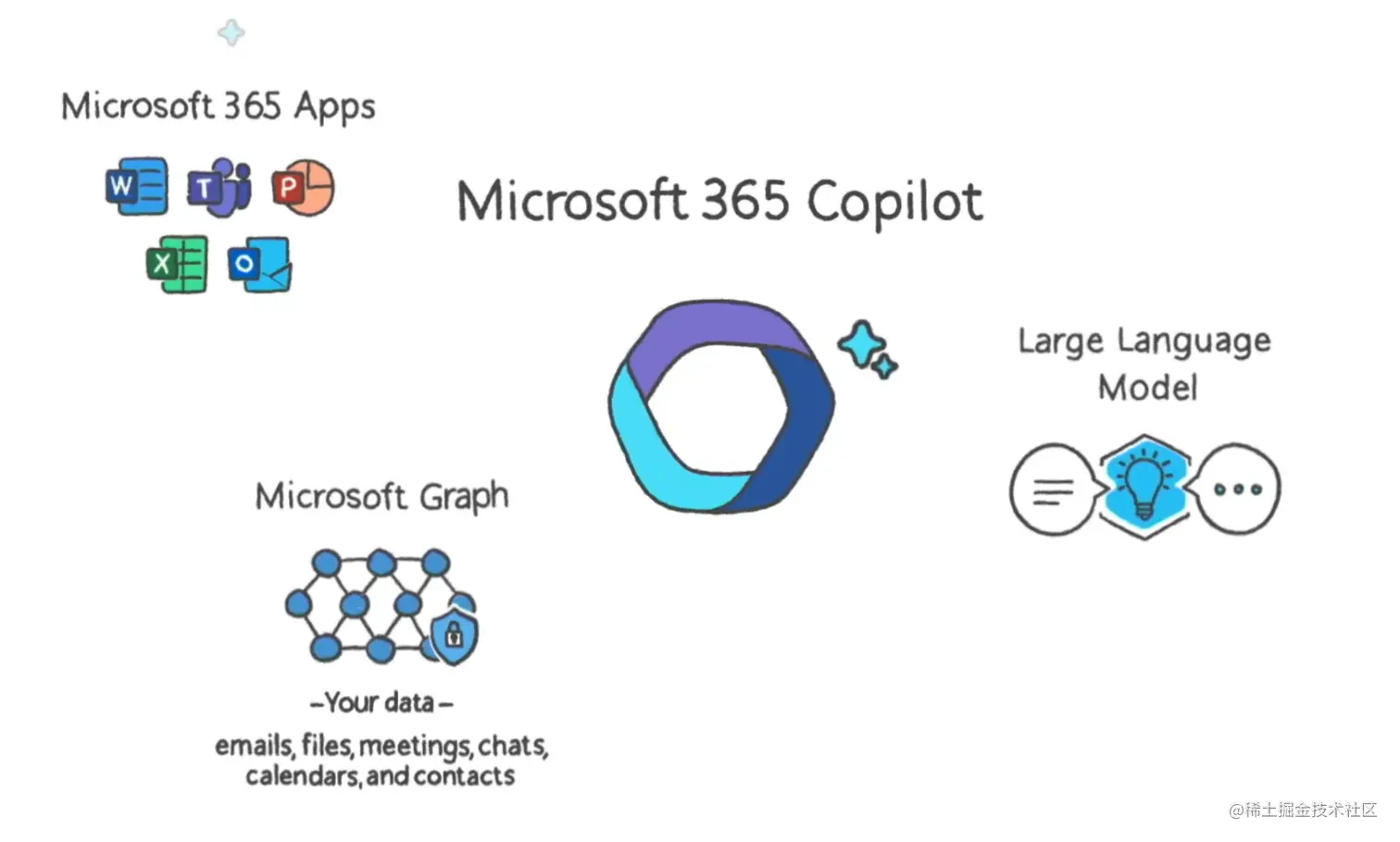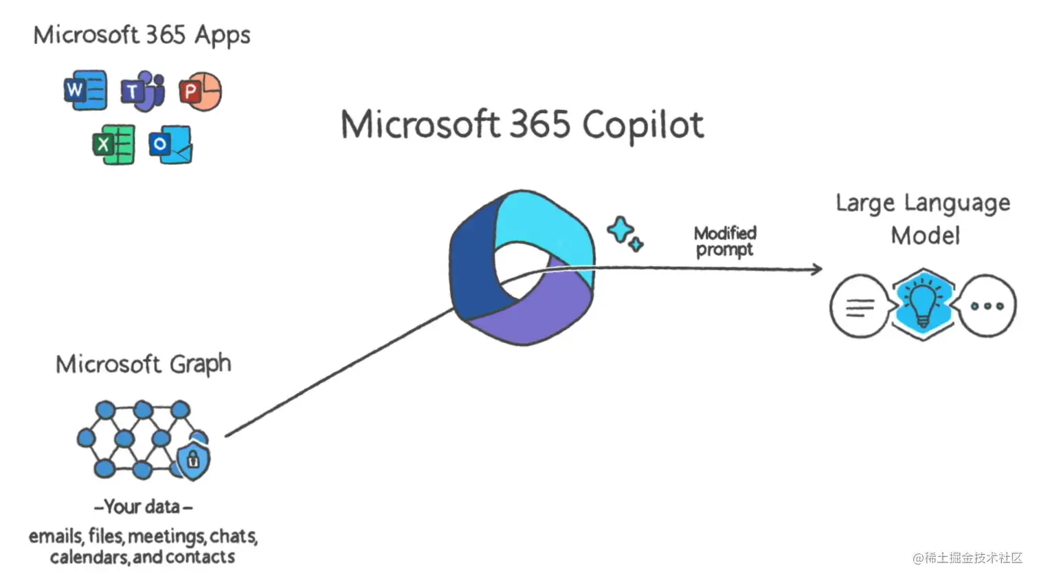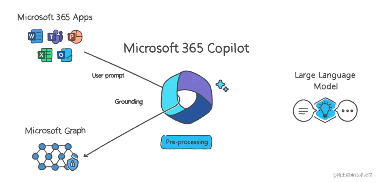 MicroSoft 365 Copilot接入微软这个办公生态系统中,在这个系统中不同格式的文件和不同展现形式的数据之间进行稳定的交互需要一个强大的技术系统。根据官方透露系统主要包含如下图所示部分:微软365应用程序(word、excel等)、用户个人数据(MicroSoft Graph)、语言大模型(GPT4)和AI中枢系统(Copilot)。