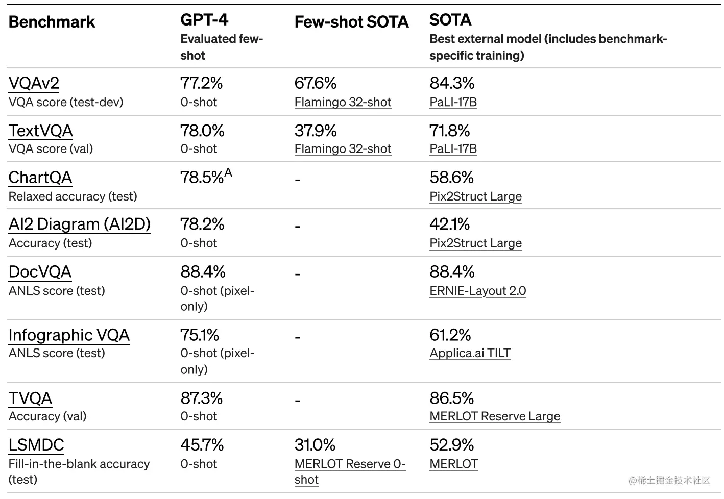 提供的七个案例,从不同维度展示了加入了视觉信号之后GPT4能力,但是由于图片输入还没有放开体验,官方补充了一些学术常用的一些数据集基准测试来评估GPT4的图片理解能力。如下图所示我们可以看到与当前的SOTA模型相比有很大的竞争力。