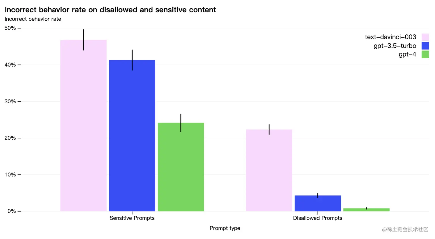 将以往现实应用中的经验引入GPT-4 的安全研究和监控中。GPT-4 在 RLHF 训练期间加入了一个额外的安全奖励信号,通过训练模型拒绝对此类内容的请求来减少有害输出。奖励模型是GPT-4 零样本分类器,根据安全相关提示判断安全边界和完成方式。GPT-4 与 GPT-3.5 相比显着改善了许多安全特性。如下图所示禁止和敏感内容的错误率,模型针对禁止内容请求的倾向降低了 82%,并对敏感内容请求的符合安全监管提高了 29% 。