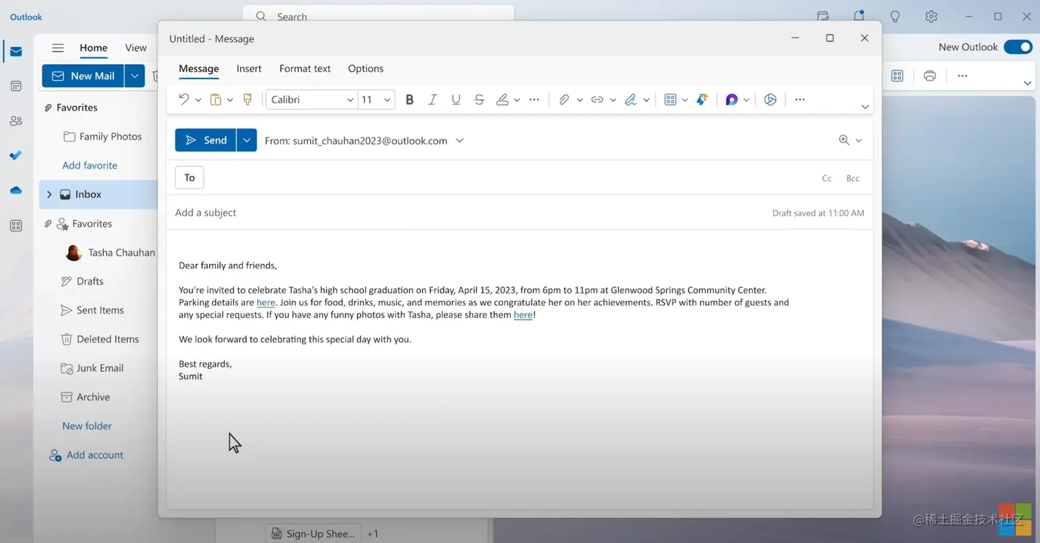 Copilot只需要你给一个开头,发一个指令,就可以可以帮你写邮件,根据自定义风格场景,自动补全及文字润色。同时还可以帮助管理邮件分类、回复、标记等操作,让你的Outlook 中更具生产力。
