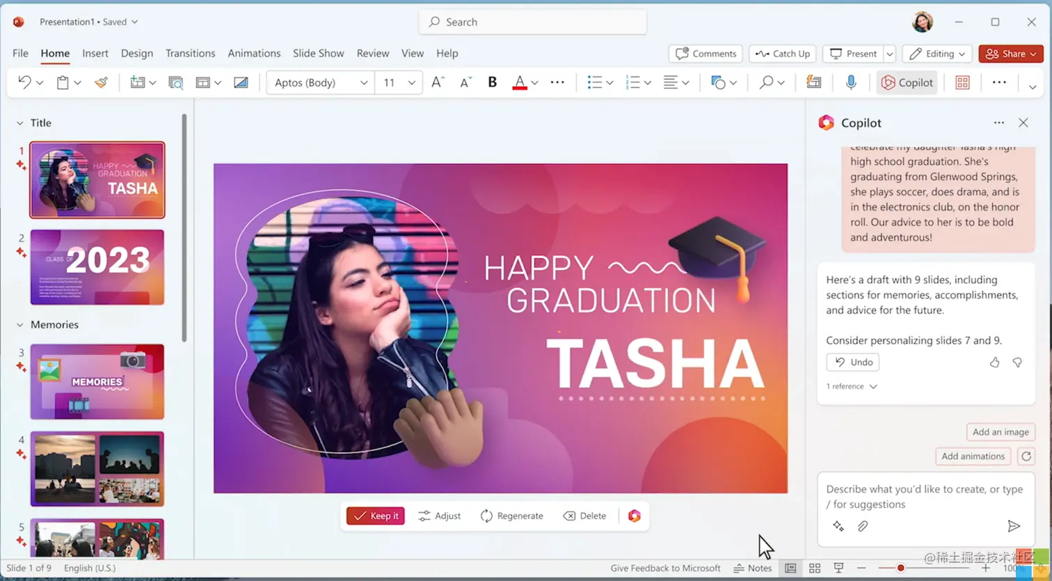 Copilot可以对话式输入命令,选择风格生车给你PPT,也可以直接有Word 文件创建一个PowerPoint 演示文稿,创建的文稿可以自由的编辑,替换页数、文字、布局、以及图片,让你的PPT更具表现力。