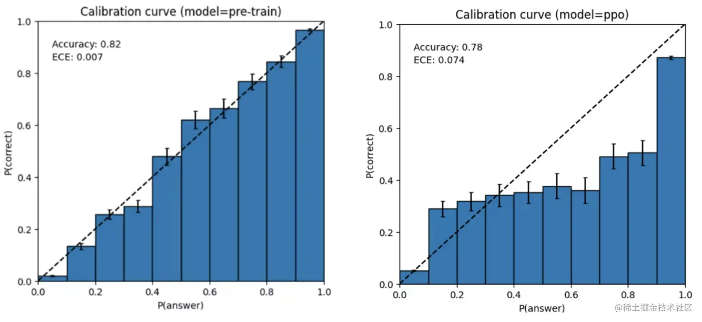 GPT-4 依然存在回到错误的时候依然坚持自信,在可能出错时不注意再次确认。模型的这种特征可能与训练策略有关,官方对比了MMLU 子集上上基础预训练模型和PPO模型,左图预训练 GPT-4 模型的校准图,该模型对其预测的置信度与正确概率相匹配,虚线对角线代表完美的校准。右图训练后 PPO GPT-4 模型的校准图,训练后对校准造成很大的影响。