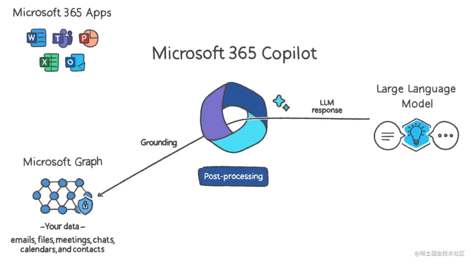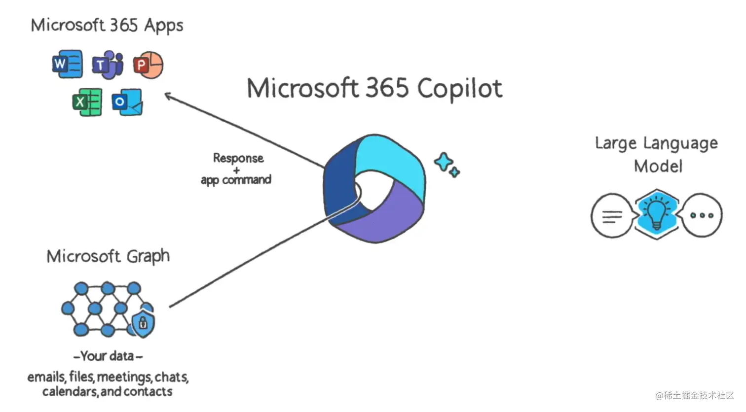 第三步,如下图所示,由语言大模型理解人类的需求,返回对应的输出给AI中枢系统Copilot,Copilot会请求Microsoft Graph 再次检查其安全性和合规性。