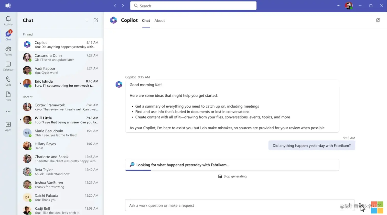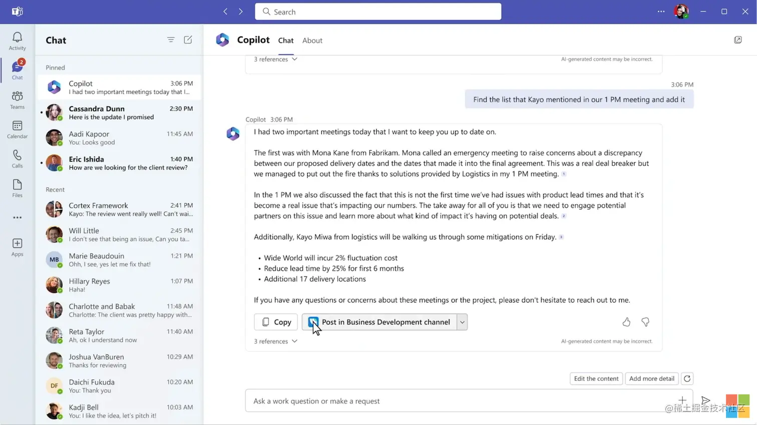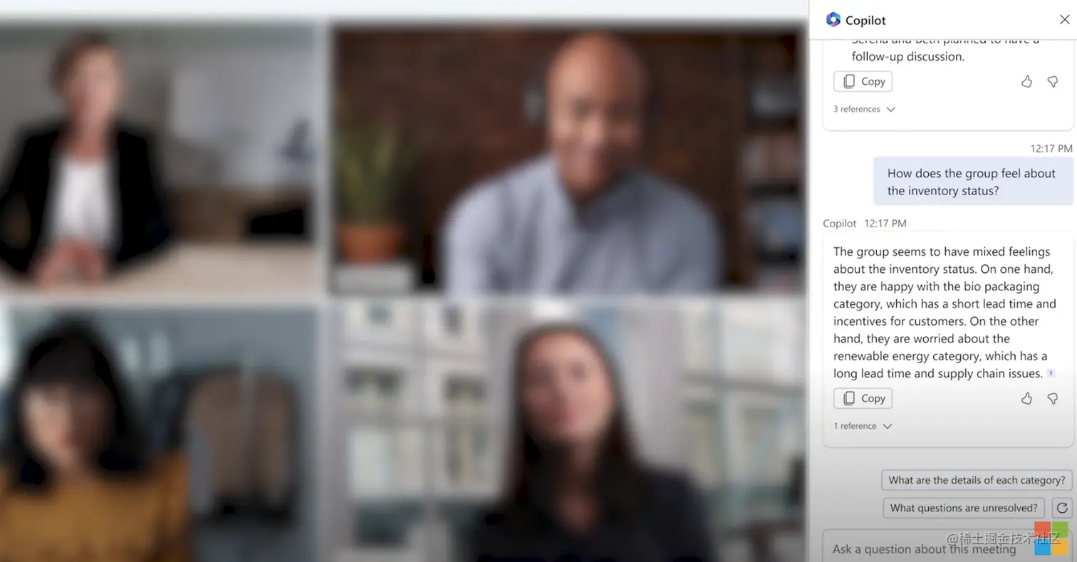 Copilot可以在Teams会议上实时总结关键讨论内容,聊天过程自动记录提出问题参考答案,可以根据指令分析优势等供讨论决策。以及一些信息自动同步、项目更新等都轻松搞定,大大提升会议效率,使Teams 更具协同性。