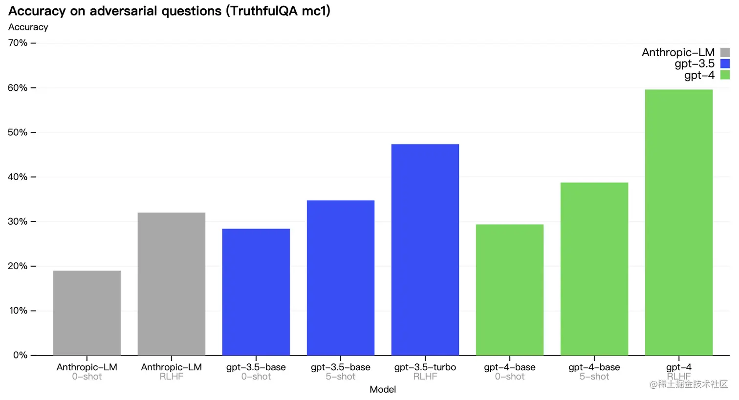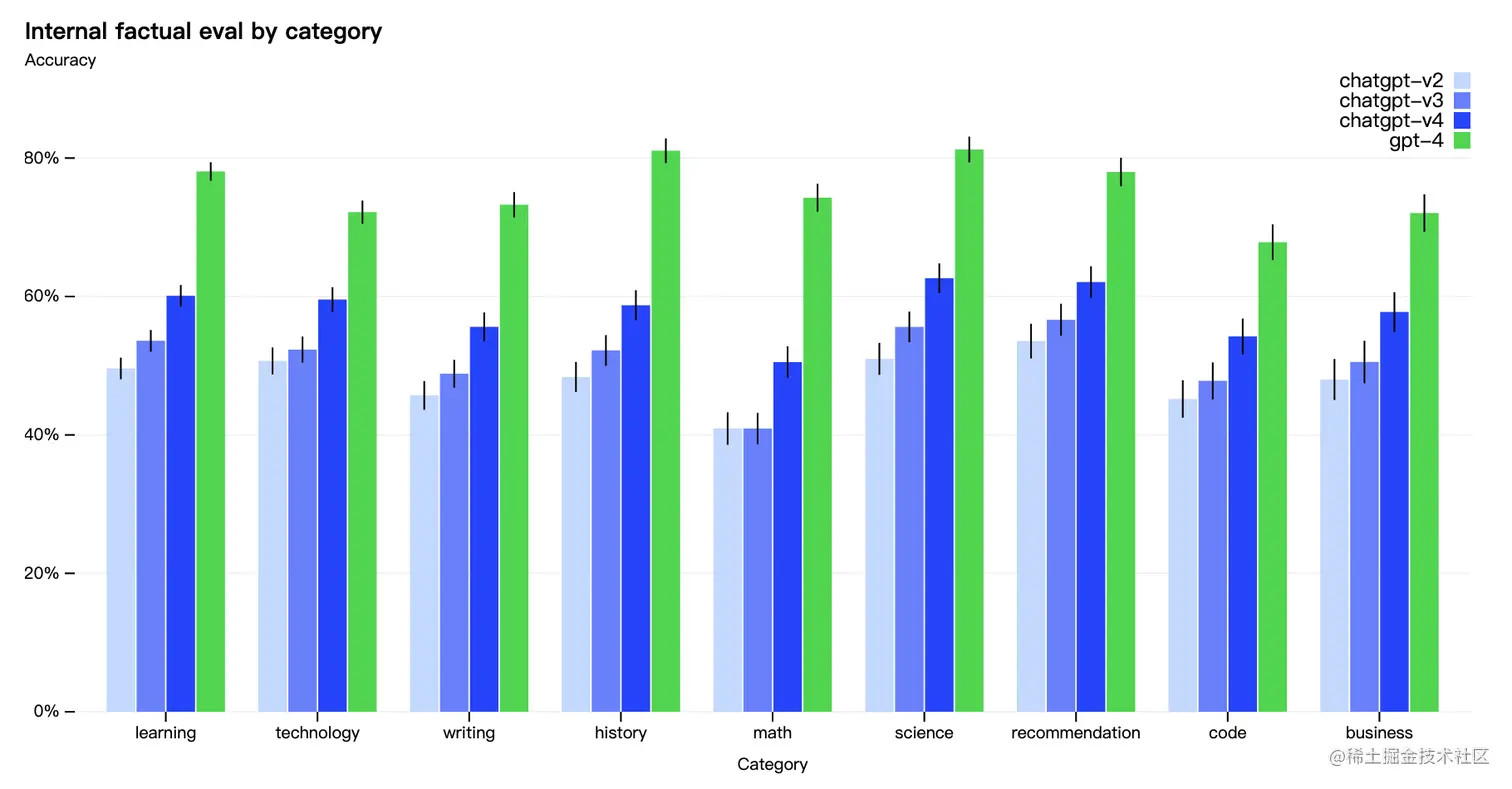 幻觉、推理错误等问题一直是大模型面临的挑战,但 GPT-4 相对于以前的模型显著减少幻觉,如下图所示,在九类内部对抗性设计的事实评估中, GPT-4(绿色)与前三个 ChatGPT 版本进行了比较,所有主题都有显着的提高。准确度为 1.0 意味着模型的答案被判断为与评估中所有问题的人类理想回答一致。在整体对抗性真实性评估中GPT-4 的得分比最新的GPT-3.5 高 40%。