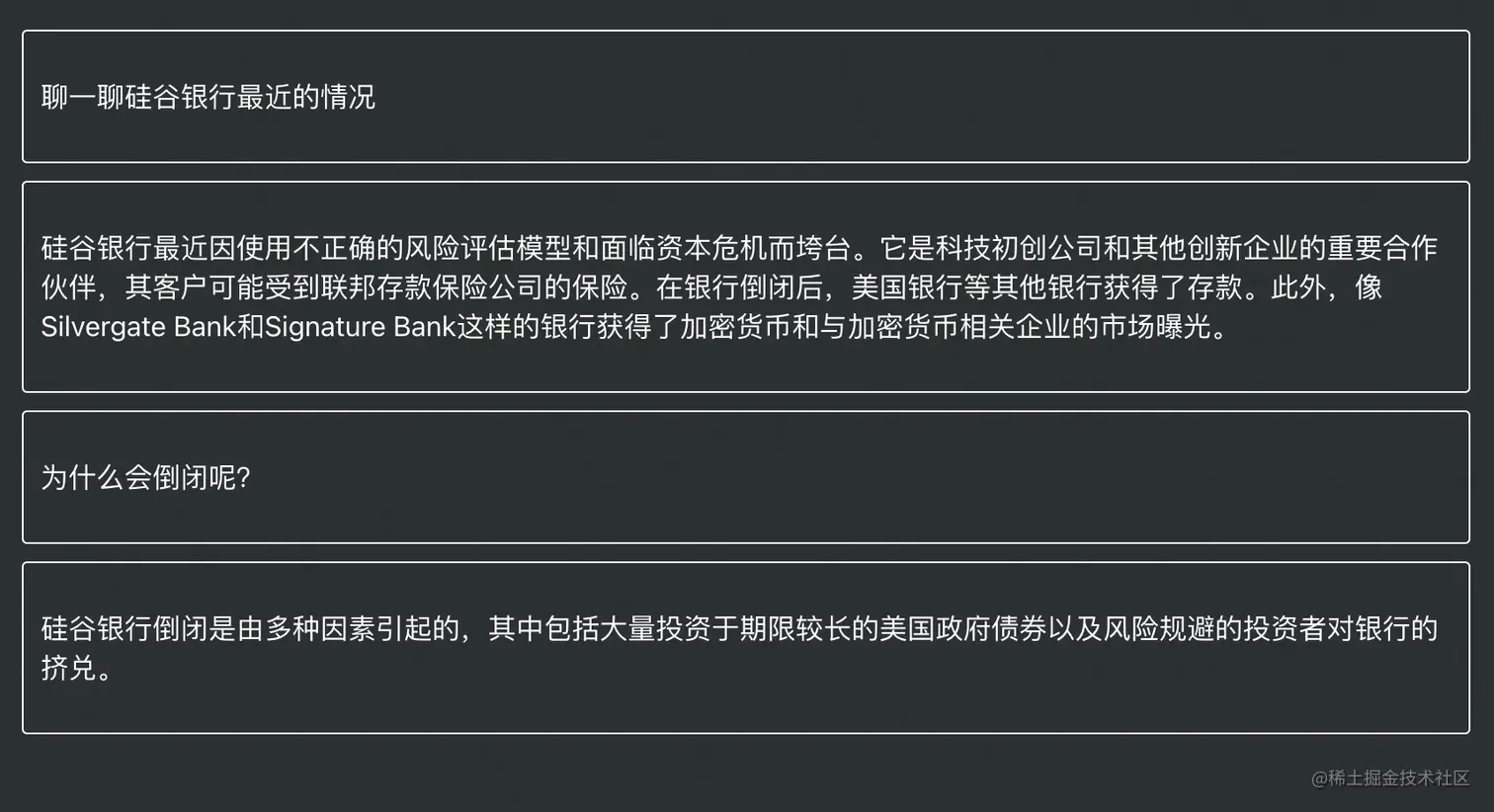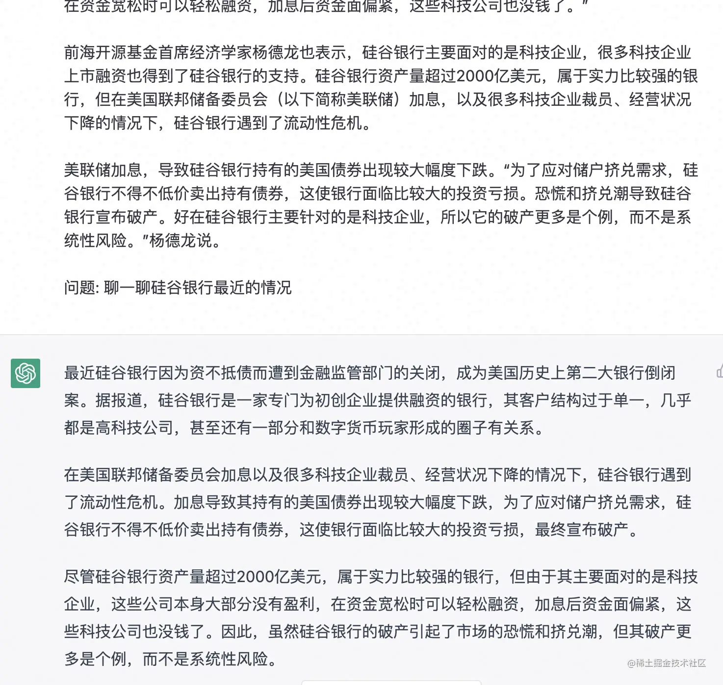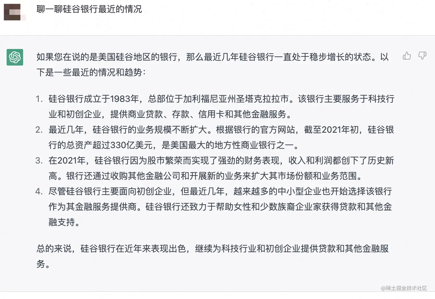 我们都知道chatGPT无法访问较新的数据,比如我希望询问硅谷银行的事情时,得到的回答是这样的: