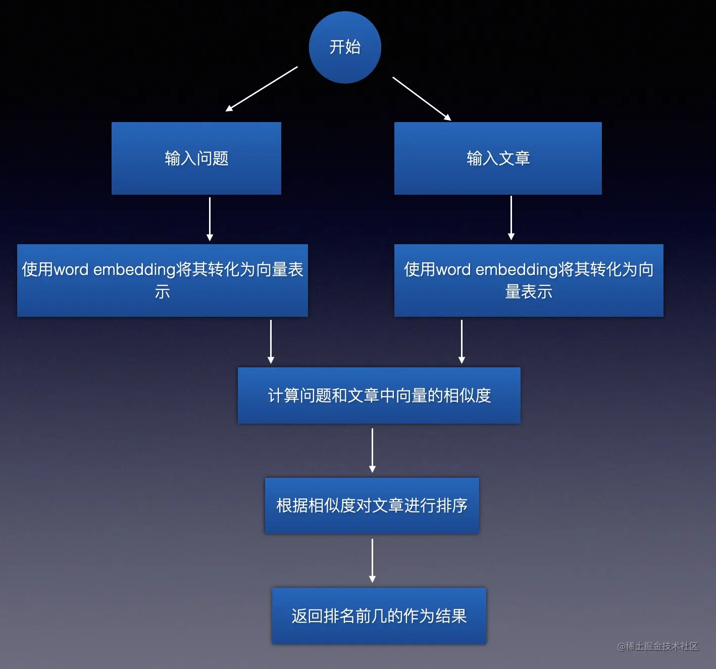 有了word embedding后,我们可以将问题和文章都转化为向量,然后通过余弦相似度等方式来从文章中寻找相似的内容。以下是流程: