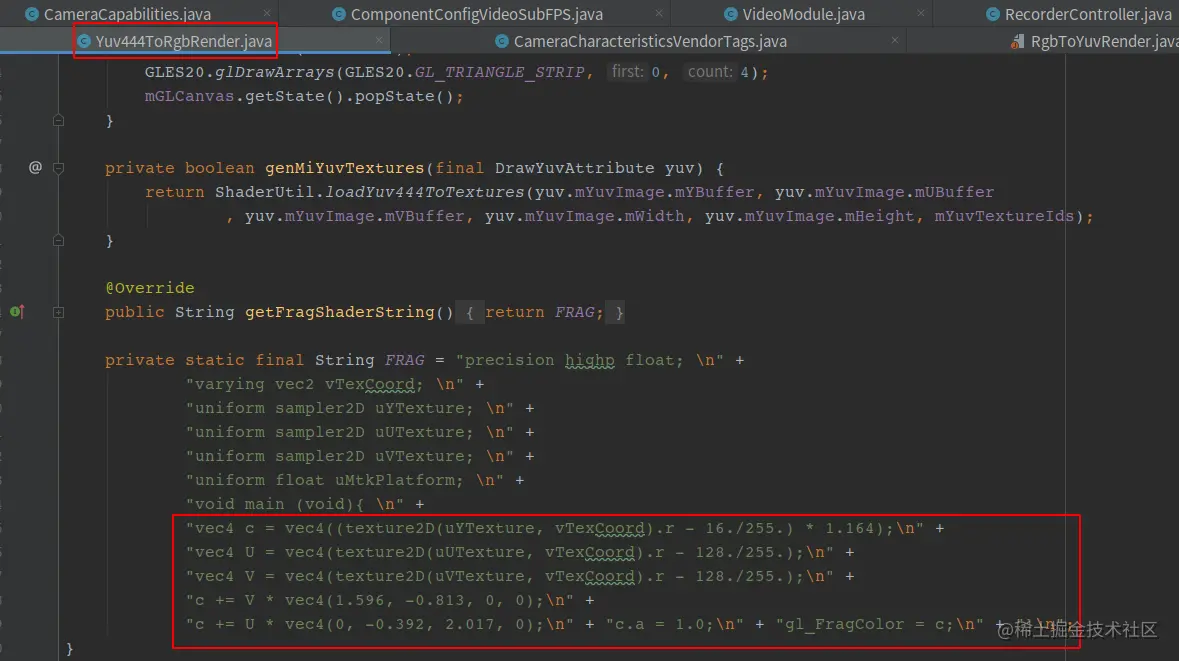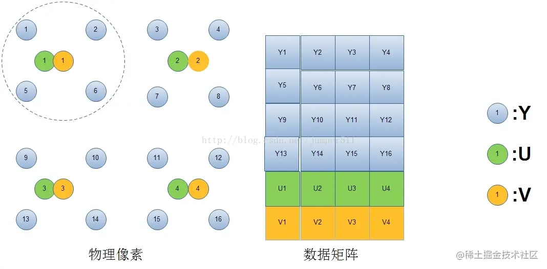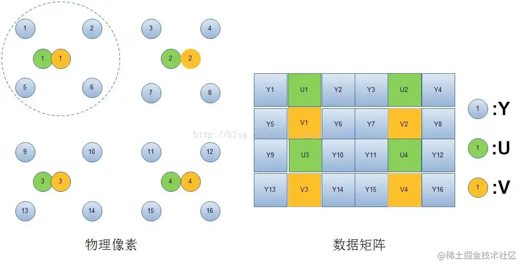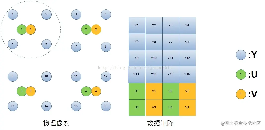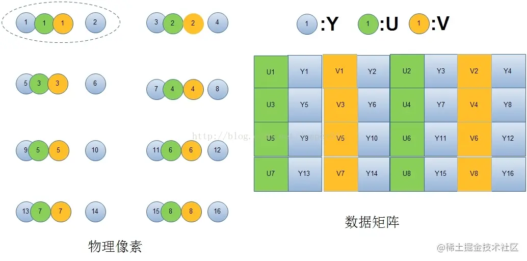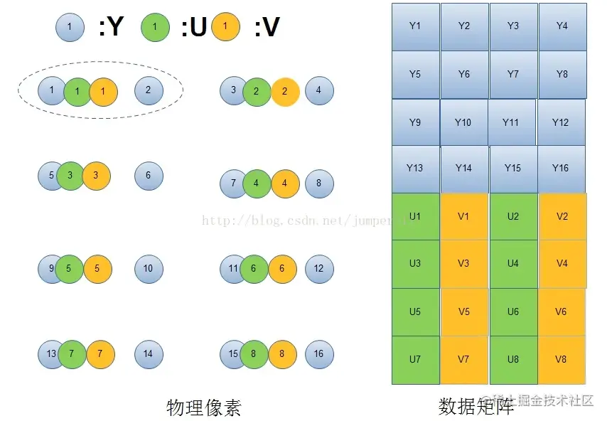 其中,每采样一个像素点,都会采样其 Y 分量,而 U、V 分量都会间隔采集一个,映射为像素点时,第一个像素点和第二个像素点共用了 U0、V1 分量,以此类推。从而节省了图像空间。