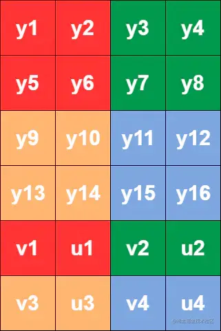 每2x2像素公用一个UV分量,Y分量后面跟U分量,然后为V分量
