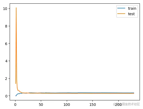 # plot_learning_curve_old(LinearRegression(), train_data, test_data, train_target, test_target)