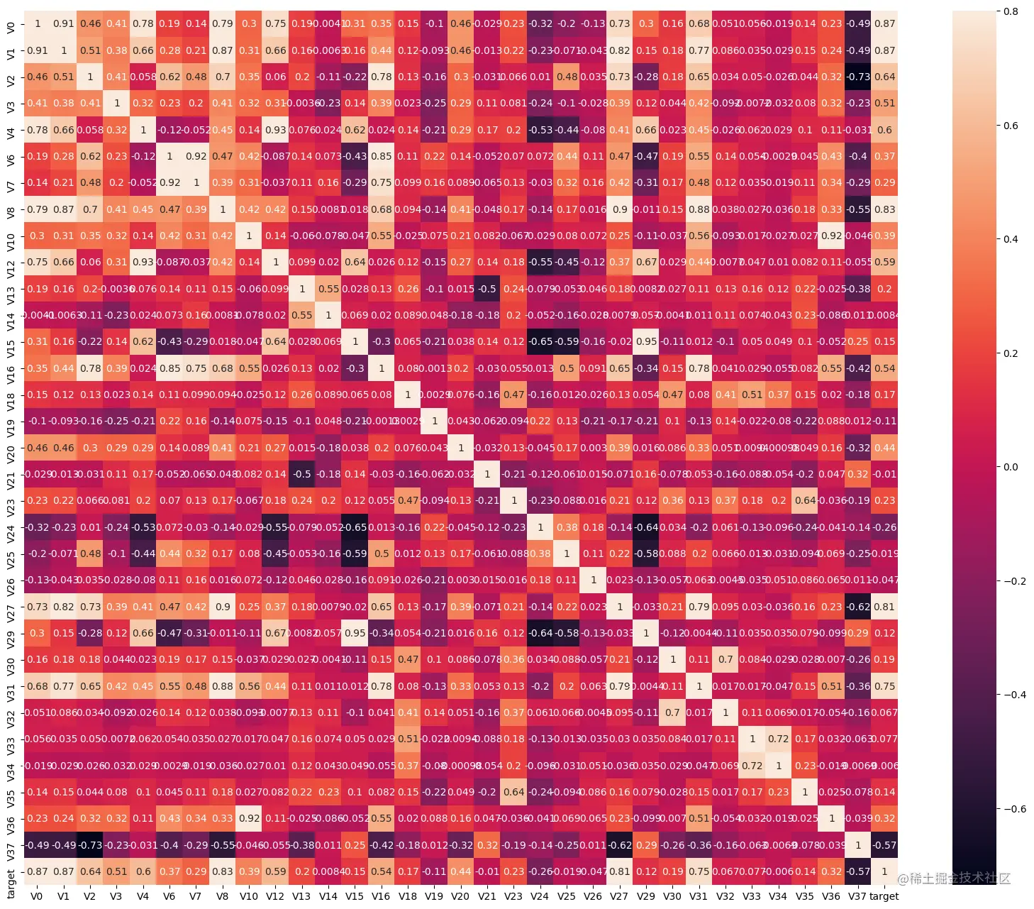 此训练集数据共有2888个样本,数据中有V0-V37共计38个特征变量,变量类型都为数值类型,所有数据特征没有缺失值数据; 数据字段由于采用了脱敏处理,删除了特征数据的具体含义;target字段为标签变量