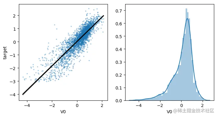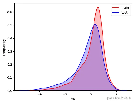 对比同一特征变量‘V0’下,训练集数据和测试集数据的分布情况,查看数据分布是否一致