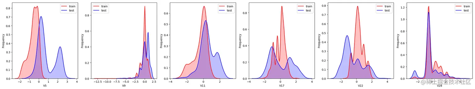 查看所有特征变量下,训练集数据和测试集数据的分布情况,分析并寻找出数据分布不一致的特征变量。