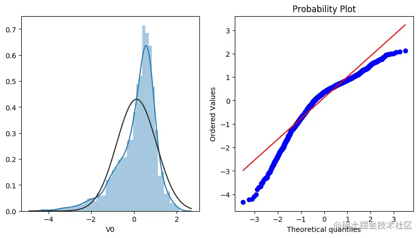 - 查看特征变量‘V0’的数据分布直方图,并绘制Q-Q图查看数据是否近似于正态分布