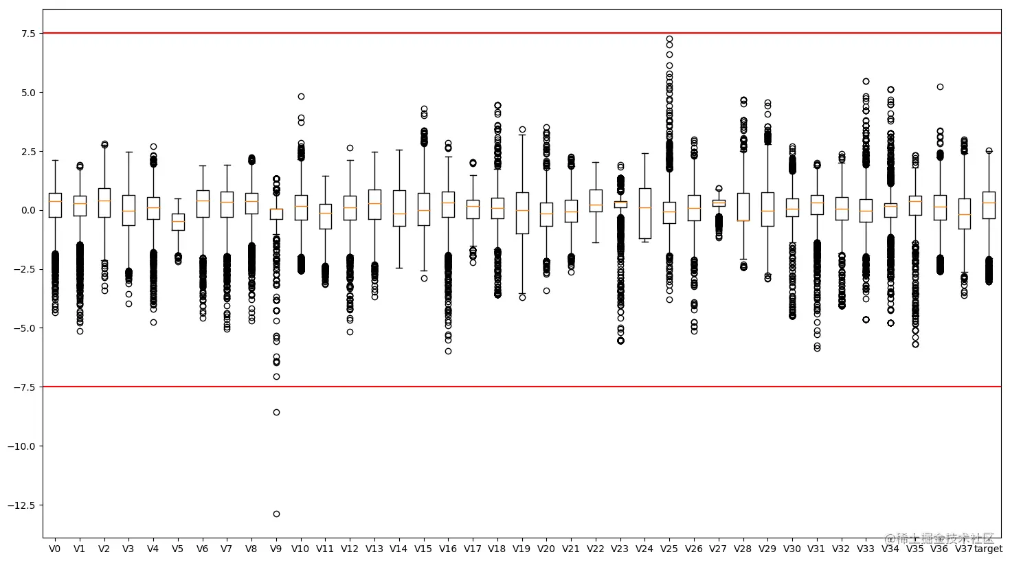 由上面的数据分布图信息可以看出,很多特征变量(如'V1','V9','V24','V28'等)的数据分布不是正态的,数据并不跟随对角线,后续可以使用数据变换对数据进行转换。