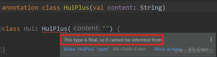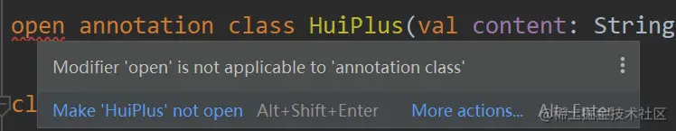 报错了看到了不,提示注解类HuiPlus需要增加open,但是给其增加open就会提示: