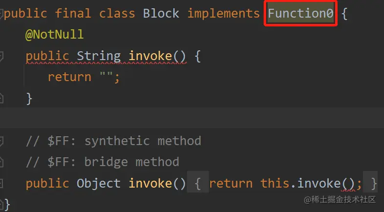 Block类的父类型就是() -> String,并且需要重写方法invoke()方法。当需要调用该类时,可以通过Block().invoke()或者 Block()()实现。