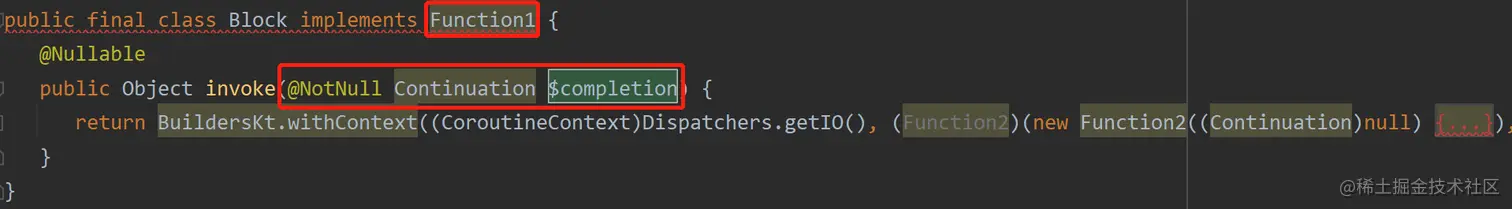 invoke方法会默认新增一个Continuation类型的参数,这个是帮助我们执行挂起函数类型的关键,所以最终实现的接口为Function1。