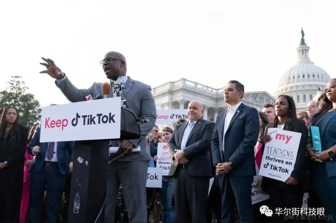 3月22日,一些美国议员以及数十名TikTok内容创作者聚集在美国国会大厦外,举着写有“保留TikTok”的标语,以示抗议。