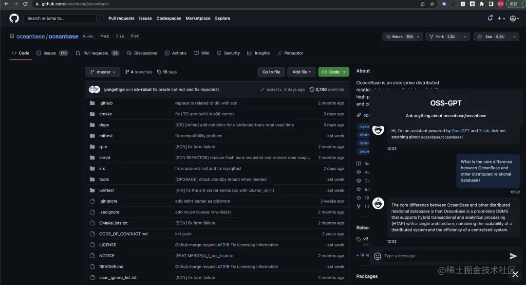 实验室的各位同学们在多次尝试后,感觉 DocsGPT 的效果非常不错,因此他们将 DocsGPT 的聊天能力集成到了实验室的浏览器插件项目 Hypercrx 中,对于已经支持的项目,安装插件后,大家只需要打开对应的 GitHub 仓库主页,即可马上体验针对当前项目的 ChatGPT 聊天问答能力。